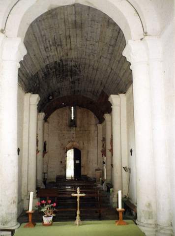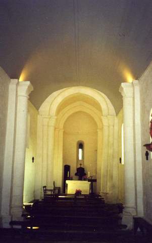 Le chevet, comme le mur nord de la nef, est couronné par une corniche soutenue par des modillons. À l’intérieur, les trois travées de la nef sont lambrissées et non voûtées en dépit de la présence de colonnes engagées. La travée du chœur est couverte d’un berceau de pierre.