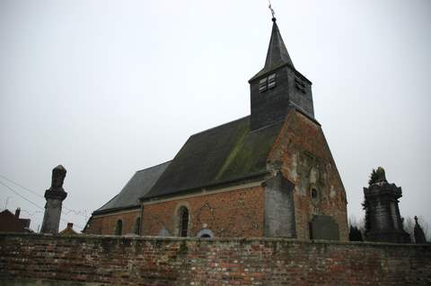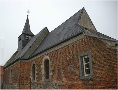 À l’ouest, derrière le grand pignon de briques, doté de rampants appareillés en tas de charge, l’actuel clocher de charpente a dû remplacer un petit clocher-mur à la fin du XVIIIe s. ou lors des réparations qui suivirent la période révolutionnaire. La porte principale s’ouvre dans l’axe de l’église, sous le millésime de 1718, dont les très grands chiffres sont dessinés par des briques en saillie, revêtues de ciment. Une porte secondaire s’ouvre sur le flanc nord de la nef, sous une pierre scellée portant la date de 1622.