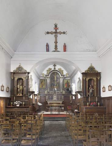À l’intérieur, couvert de voûtes de plâtre sur lattis, le mobilier en chêne peint, rehaussé de motifs dorés, forme un bel ensemble du XVIIIe siècle. Le coffre d’autel et le tabernacle, ornés d’un calice surmonté d’une hostie rayonnante, étaient encadrés d’angelots ; ils ont malheureusement été volés dans les années 1980. Au centre du retable, la Crucifixion peinte porte la date de 1843, mais les deux autres peintures, représentant saint Joseph et saint Jacques de Compostelle, remontent vraisemblablement au don fait en 1775 par Nicolas-Joseph de Behault et Ursule Hanoye qui possédaient la gentilhommière voisine. Des stalles complètent ce mobilier, de même que deux autels secondaires, placés à l’entrée du sanctuaire et dédiés à la Vierge et à saint Martin.