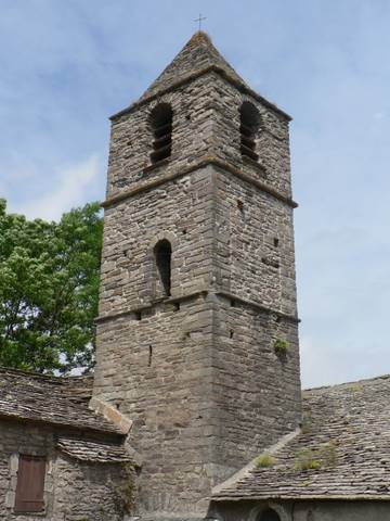 Le fût du clocher est sans doute la seule partie authentiquement médiévale de cette église ; il comporte trois étages, séparés par des cordons en pierre ; des piédroits de baies anciennes sont repérables sur la face est de l’étage médian. L’étage supérieur est plus tardif que la partie basse ; il pourrait dater de la fin du Moyen Âge, mais la pyramide en pierre qui le couvre est nécessairement du XVIIe, au plus tôt, si l’on se réfère au texte de la visite pastorale de 1636.