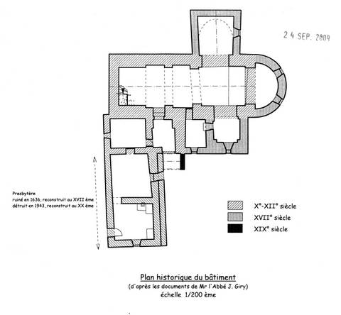 En l’absence d’une difficile analyse archéologique, on pourra néanmoins postuler que l’implantation et le plan de l’édifice correspondent à l’édifice médiéval, sans doute déjà agrandi (la différence des systèmes de voûtement serait-elle la reproduction d’une différence antérieure, conséquence d’un allongement de l’église ?). Des chapelles latérales, différentes au nord et au sud, lui ont en outre été ajoutées à l’époque moderne, et l’abside est entièrement du XVIIIe siècle.