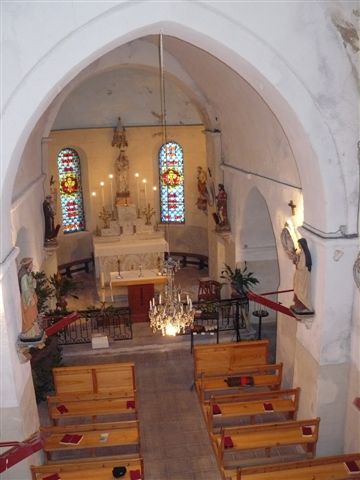 À l’intérieur, l’église ne présente presque pas de mobilier ancien, si ce n’est un tableau peint sur bois, de la fin du XVIIe ou du XVIIIe s., représentant l’Assomption de la Vierge, qui doit être l’ancien tableau du maître-autel[5]. Aujourd’hui l’autel néo-gothique, du début du XXe s., est encadré de deux vitraux datant de 1958, très représentatifs de cette époque. Un autre tableau comparable par le style au premier, représente saint Pierre ; il ornait peut-être un des autres autels. On peut aussi remarquer les fonts baptismaux, cuve monolithe encastrée dans le mur occidental et protégée par une boiserie du XIXe siècle.