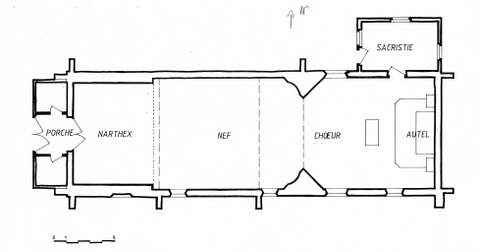 À l’extérieur, l’édifice est dominé par un clocher tardif sommé d’un lanternon. À l’ouest a été élevé un avant-corps en briques qui masque le pignon et la porte d’entrée. Sur le mur nord de la nef, en petits moellons cubiques, on peut lire la trace de quelques ouvertures anciennes. Une grande fenêtre a été ouverte au XVIIIe s. du même côté, pour éclairer le chœur. Du côté sud, trois grandes ouvertures, et une petite au niveau de l’abside, ont été percées ; la première travée était éclairée par une baie à remplages gothiques, qui est condamnée.