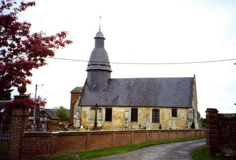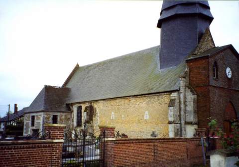 L’église actuelle a sans doute une origine ancienne, ce que confirmeraient le vocable de Saint-Pierre et la présence de deux petites baies romanes. Elle est construite en moellons de silex, à l’exception de l’avant-corps tardif en brique. De plan rectangulaire, elle comporte trois travées, la première étant légèrement plus étroite que les suivantes, la dernière formant chœur à chevet droit. Une sacristie a été accolée au nord du chœur.