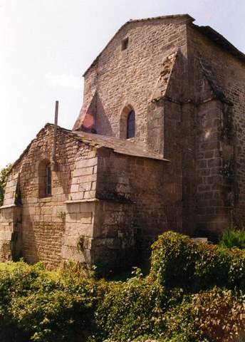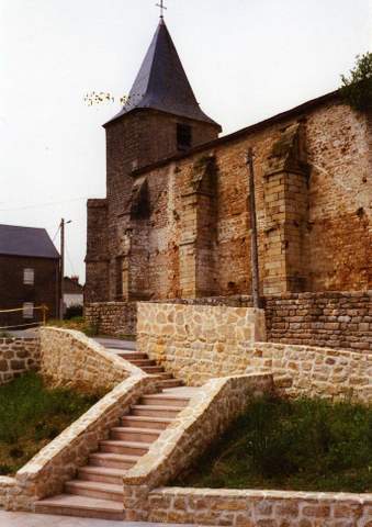 XIVème siècle. La face nord de la nef est épaulée par un gros contrefort renfermant un escalier en spirale qui permettait d’accéder au clocher primitif situé au niveau de la première travée.