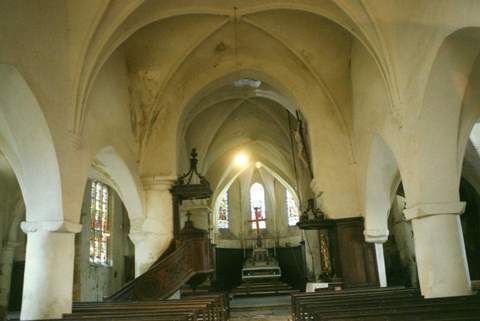 Au centre d’un village qui a gardé dans son ensemble l’aspect qu’il avait au XVIIIe s., l’église Saint-Martin est un édifice intéressant. On peut suivre toutes les étapes de sa construction commencée au XIIe s. et poursuivie jusqu’au milieu du XVIe s. La nef de trois travées est séparée des bas-côtés par des arcades en plein cintre retombant sur de simples tailloirs aux angles abattus qui surmontent de grosses piles monocylindriques. La position initiale du clocher au-dessus de la travée du chœur s’est trouvée modifiée et déportée vers la nef par le développement important donné au chœur et à l’abside à la fin du XIIIe ou au XIVe s., date suggérée par les chapiteaux du chœur. Le clocher, avec sa toiture en bâtière, soulignée par des modillons, et ses baies géminées, aux arcs légèrement brisés surmontés de cor dons de billet tes, peut être daté de la fin du XIIe s. Le reste de la construction : abside, chapelle de la Vierge, bras du transept sud ainsi que la voûte sur croisées d ‘ogives (à l’exception du transept nord et de la chapelle Saint-Antoine) appartiennent au XIVe s., peut-être même au XVe. Vers 1555, on a repris le transept nord et la chapelle voisine. Le remplage des baies est Renaissance et la voûte com porte des liernes, tiercerons et clés pendantes. L’église est inscrite à l’Inventaire supplémentaire des Monuments historiques. De nombreux objets mobiliers sont classés ou inscrits . En 1938 , des travaux avaient été effectués sur la toiture et le clocher, grâce à l’intervention de la Marquise de Maillé. La Sauvegarde de l’Art Français, sollicitée en 1990 pour la mise hors d’eau indispensable de l’édifice (couverture du clocher, du transept et de l’abside) a subventionné ces travaux pour la somme de 70 000 F.