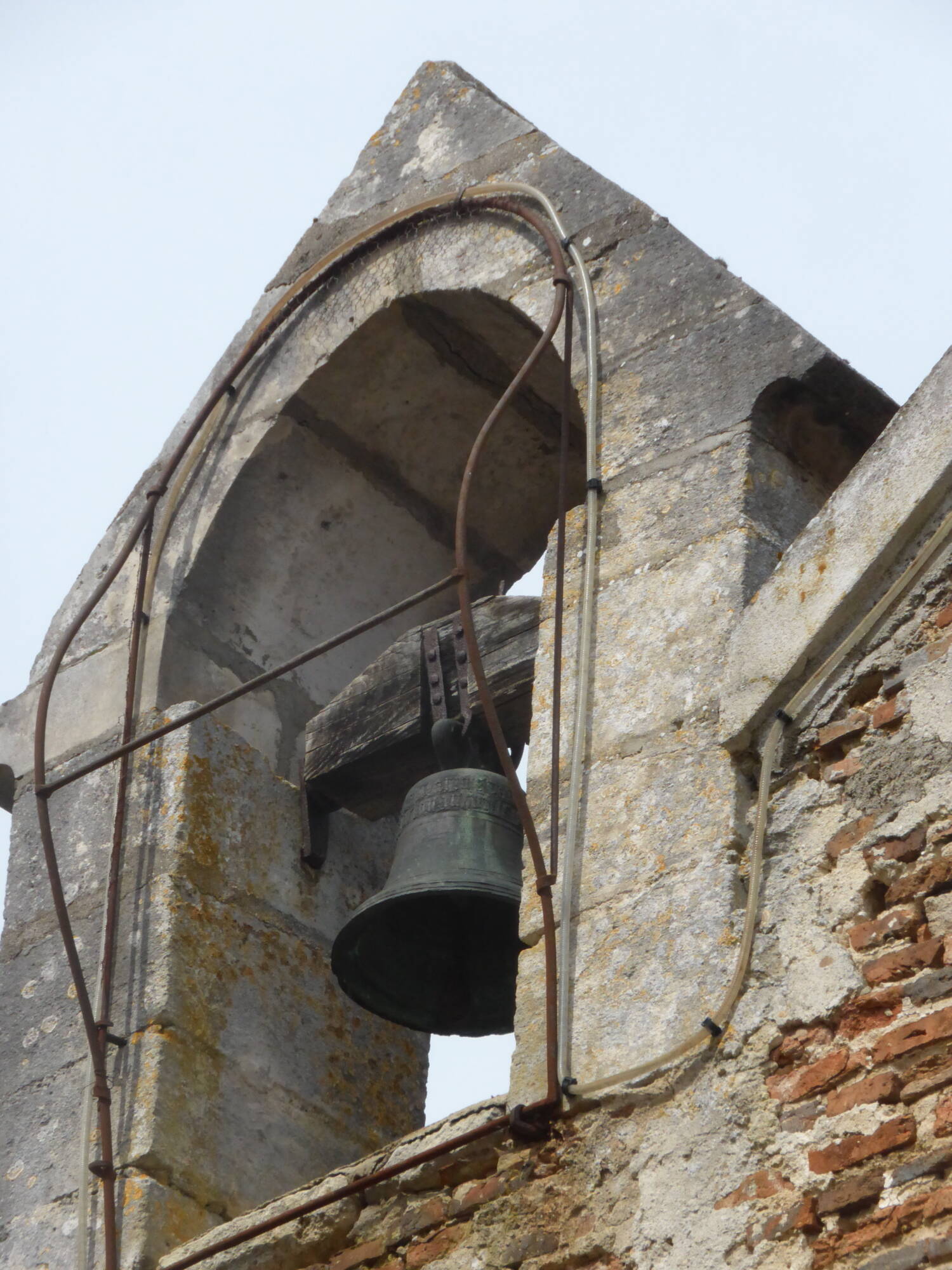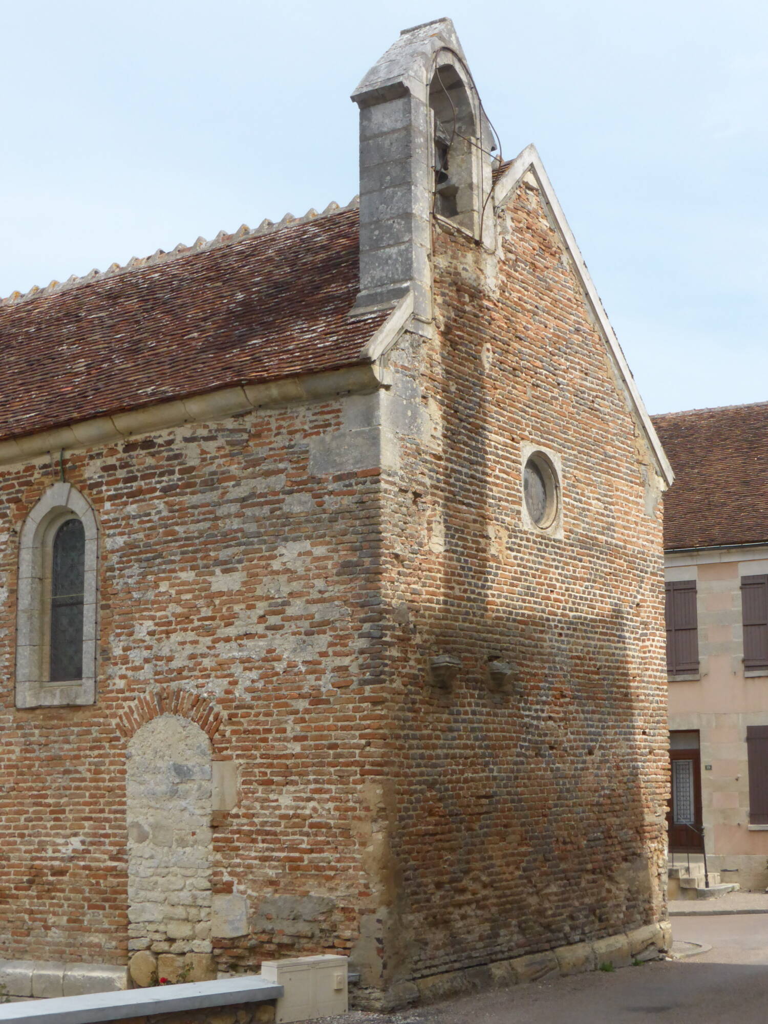 La construction est réalisée en briques, dont certaines sont vernissées et disposées en motifs de losanges décoratifs, élément vernaculaire fort visible sur les façades. L’édifice conserve un bénitier ancien daté de 1643, témoignant de la permanence du mobilier liturgique d’origine, tandis que l’enclos qui l’entoure correspond aux vestiges d’un ancien cimetière d’enfants.