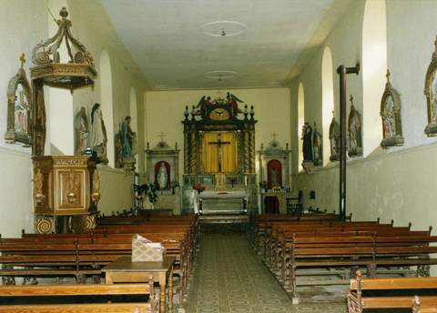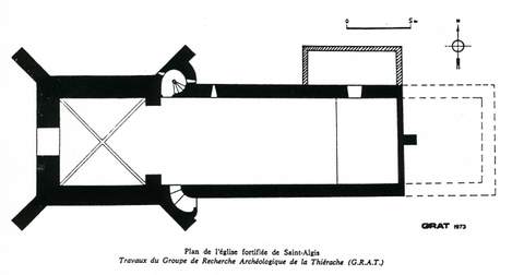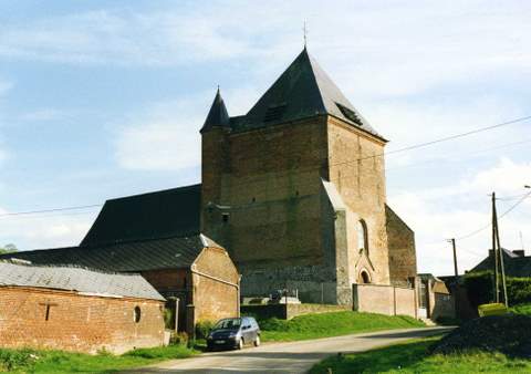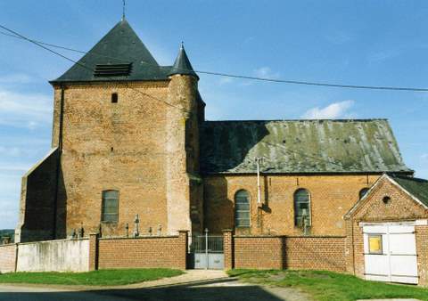 Le village de Saint-Algis en Thiérache cire son nom d’un Irlandais, Algis, ordonné prêtre, qui vint avec quelques compagnons fonder en ce lieu un oratoire dédié à saint Pierre, où il fut inhumé en 670. L’afflux de fidèles attirés par des miracles contribua à la formation du village. L’église est caractérisée par un donjon carré d’environ dix mètres de côté hors œuvre , les murs approchant trois mètres d’épaisseur. Ce clocher devait à l’origine être pourvu de quatre tourelles aux angles, dont deux subsistent. Malgré ces transformations, il reste l’un des plus imposants parmi ceux des églises fortifiées de la Thiérache. La nef, comme le donjon, est construite en brique au-dessus d’ un soubassement en grès. Les dates de 1685 et 1687 figurent tracées en briques vernissées, respectivement sur les murs sud et nord . Sur le donjon, on interprète généralement une date tronquée comme le millésime 1634. Il n’est pas exclu qu’il s’agisse là de travaux de restauration, le monument dans son gros œuvre pouvant remonter à la seconde moitié du XVIe s. Le chœur fut démoli en 1806, la nef simplement plafonnée est donc désormais fermée par un mur plat devant lequel est installé un retable du XVIIe s. Un nouveau portail fut percé dans le mur ouest du clocher en 1858. En 1994 la Sauvegarde de l’Art Français a versé une subvention de 20 000 F pour la réparation de la toiture.