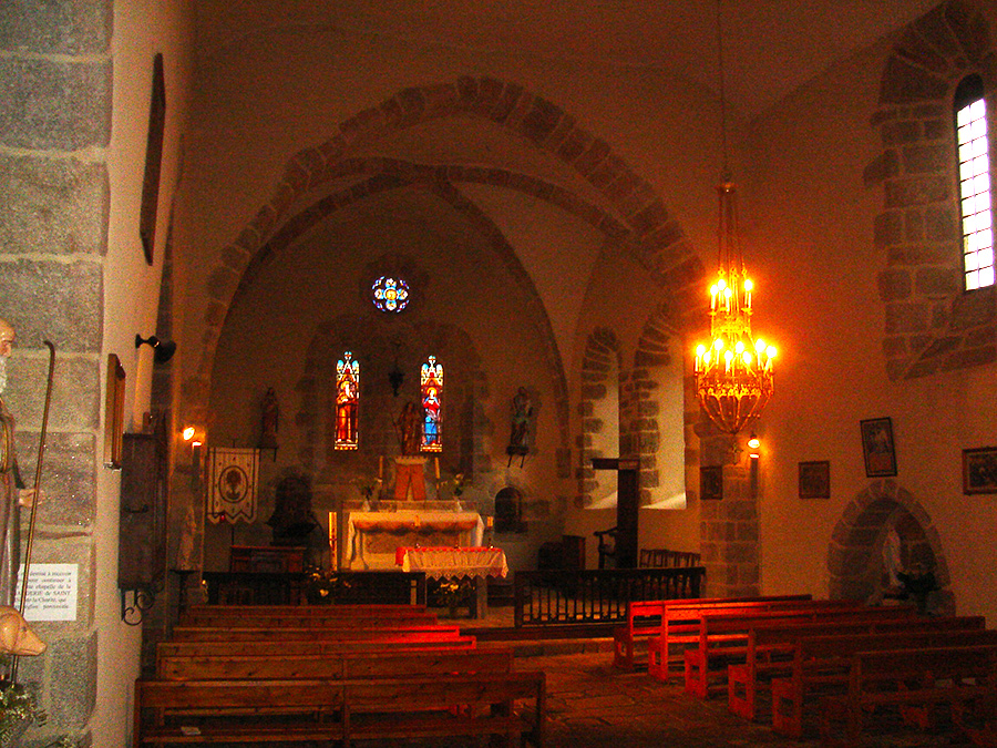 Cette charmante église est composée d’une nef et d’un choeur à chevet plat. Deux chapelles s’ouvrent sur le côté nord de la nef. Elles sont voûtées d’ogives comme le choeur. Une sacristie, voûtée en berceau, est aménagée en dessous du clocher, qui est lui-même une tour à trois niveaux, surmontée d’une flèche et accolée au côté sud de la nef.