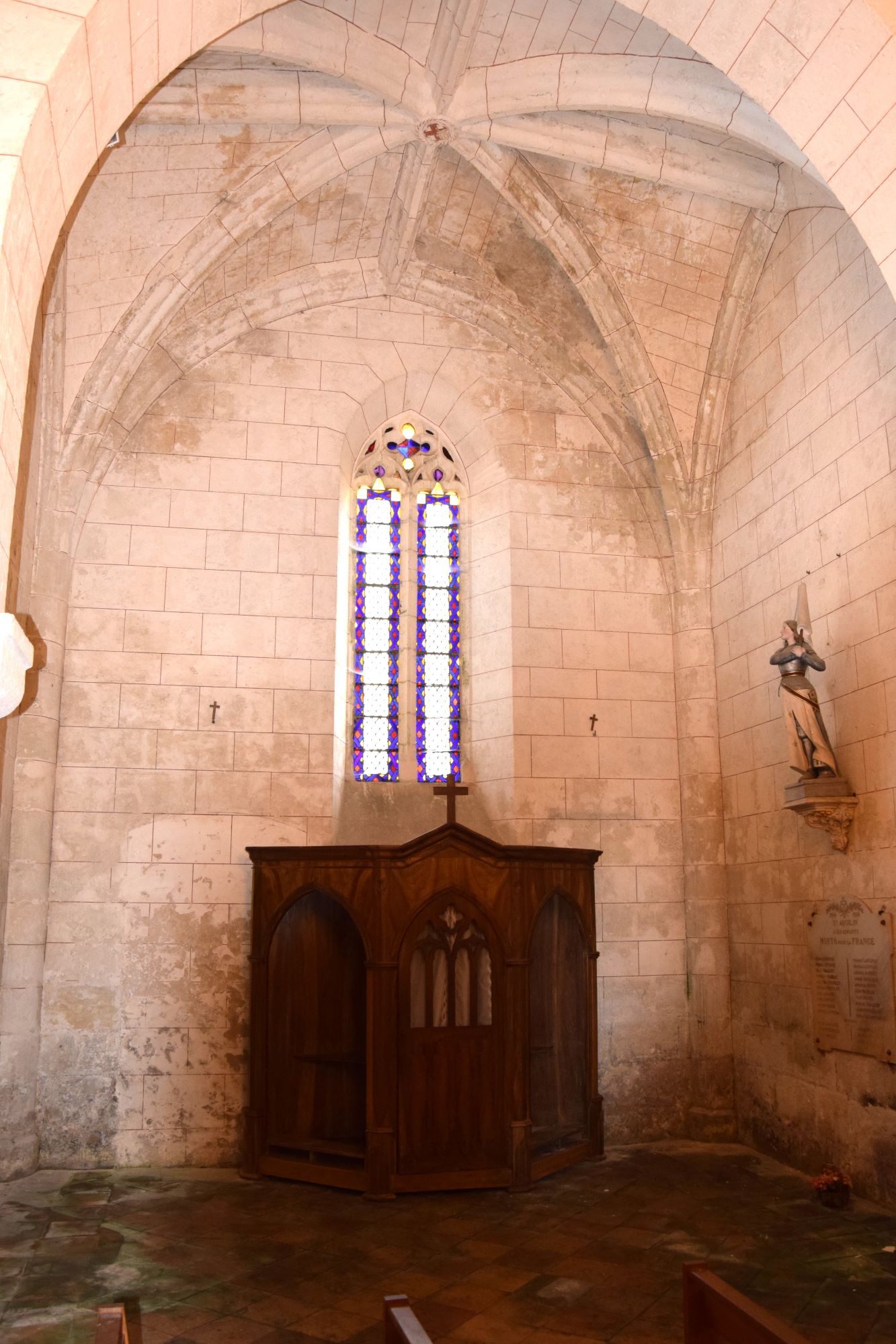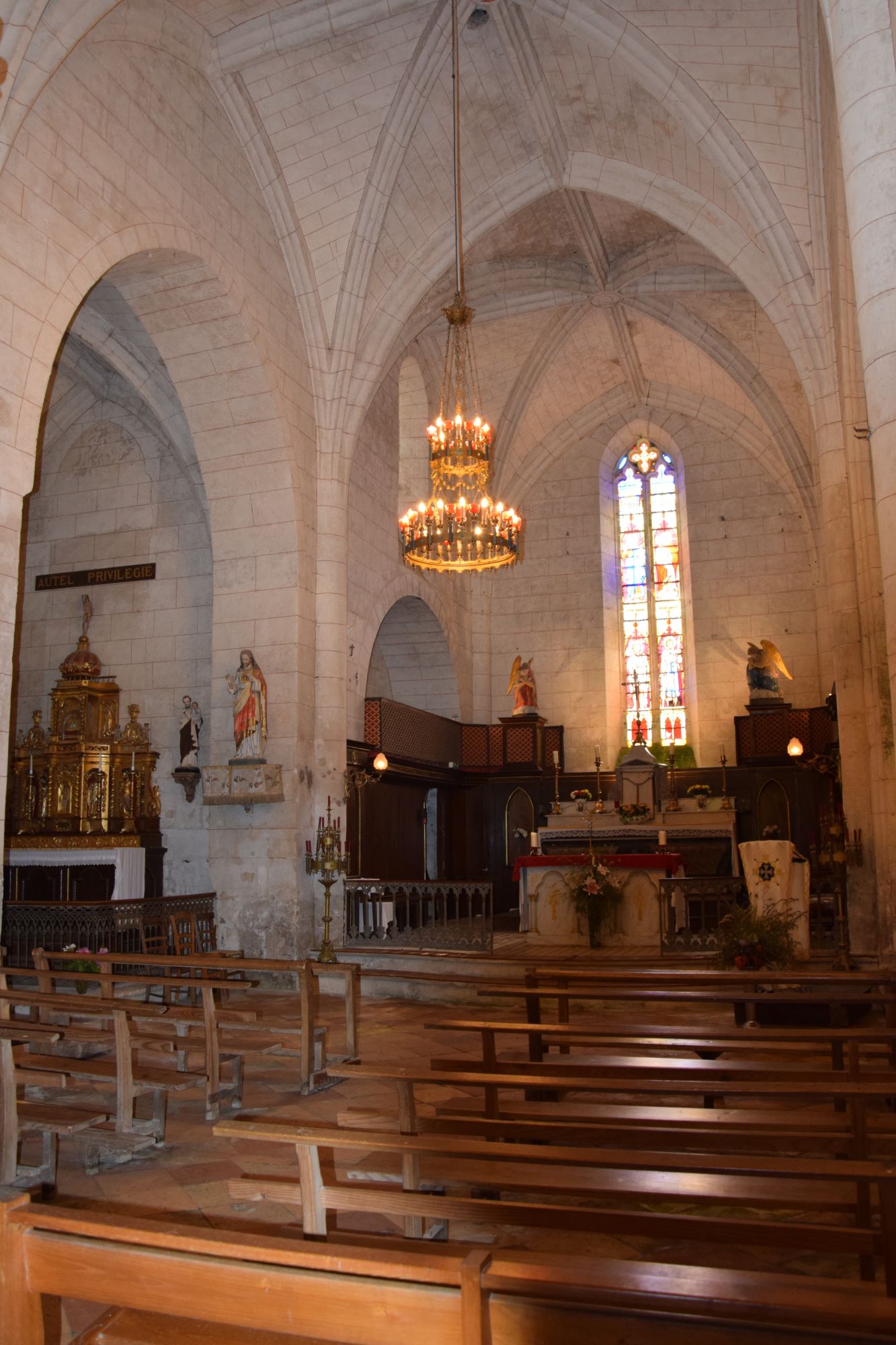 L’église se compose d’une nef de trois travées et d’un chœur à chevet plat, flanqués de chapelles et d’arcatures. Les murs gouttereaux abritent trois chapelles au nord et deux au sud, éclairées par des baies moins hautes que celle du chevet, qui est ornée de remplages flamboyants. La voûte est en croisées d’ogives, avec des nervures retombant sur des colonnes engagées, sauf dans la chapelle nord-est où elles reposent sur des cul-de-lampes simples.