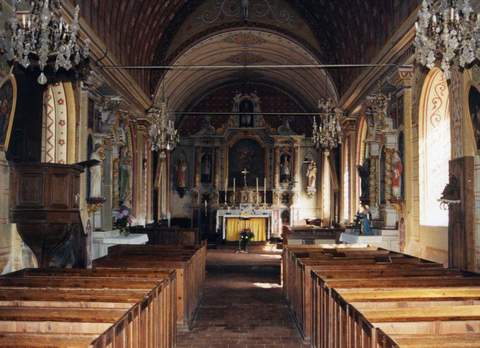 L’église, dédiée à saint Aubin, remonte en grande partie au début du XIIIe s. et son droit de patronage, qui appartenait d’abord aux familles d’Aunou et de Bonneval, revint en 1287 à l’abbaye de Saint-André-en-Gouffern qui le conserva jusqu’à la Révolution. Elle se compose d’une nef à vaisseau unique précédée d’un clocher porche à pans de bois, original et élégant, édifié vraisemblablement entre la fin du XVe s. et le début du XVIe siècle. Au XIXe s., d’importants travaux furent engagés qui, en dépit de leur ampleur, ne dénaturèrent pas, dans leur ensemble, l’édifice. On changea alors le lambris de la nef ; on détruisit en 1853 le portail d’origine couronné d’un gâble qui, pourtant, avait survécu à la construction du clocher-porche; on substitua entre 1860 et 1862 aux essentes de chêne qui couvraient jusque-là le clocher-porche une couverture d’ardoises. Néanmoins l’édifice conserve un charme d’ensemble que lui confère pour une grande part l’élégant ouvrage à pans de bois qui accueille le paroissien, sans oublier la conservation de nombreux vestiges anciens qui témoignent de la qualité de la construction d’origine. Le matériau de l’édifice varie selon les parties : pierres de taille, moellons, assises de silex. Le chœur qui conserve sur ses murs nord et sud des éléments romans de décor sculpté constitue la partie la plus ancienne. Le clocher-porche se compose de quatre travées, la quatrième percée au nord et au sud de baies cintrées ; il s’élève sur trois niveaux en encorbellement. Les poteaux des deux premiers niveaux sont sculptés en pied et en tête ou décorés de culots, tandis que ceux du troisième niveau sont beaucoup plus simples et dépourvus de sculptures. L’ouvrage est couronné d’un clocher dont la flèche, de plan octogonal, est soulignée par quatre égouts superposés de plan carré formant abat-son. Des cartes postales anciennes attestent que le triangle du pignon occidental était, depuis les campagnes de travaux du XIXe s., couvert d’ardoises; cette toiture fut déposée en 1962. Les motifs sculptés représentent des dessins géométriques ou des têtes d’animaux et de personnages. À l’intérieur, l’église, largement éclairée grâce à l’ouverture de grandes baies au profil brisé et aux moulurations soignées dans ses murs gouttereaux nord et sud, est couverte d’une voûte lambrissée au berceau brisé dans la nef et de plein cintre dans le chœur. Leur décor peint au pochoir, qui alterne avec bonheur les motifs géométriques, trahit une reprise au XIXe s. ; il confère cependant une élégance indéniable au décor d’ensemble de l’édifice. Celui-ci d’ailleurs conserve un mobilier d’une grande richesse dont la commande remonte pour ses principaux éléments au XVIIe s., notamment le maître-autel à colonnes, volutes, fronton brisé, et la poutre de gloire accrochée au mur du fond de l’église avec les statues du Christ et de sainte Madeleine. Quant au porche qui, à l’intérieur, ouvre directement sur la nef, il a reçu lui aussi une décoration soignée qui s’harmonise totalement avec le reste du décor intérieur. Motifs peints au pochoir sur les murs et la voûte lambrissée en berceau et pavage de tomettes carrées font ressortir les éléments de mobilier que renferme de façon notable ce porche : d’un côté, un bénitier de grès du XVIe s. et de l’autre, des fonts baptismaux en marbre rouge et gris du XIXe s., sans omettre deux panneaux peints, Le Baptême du Christ et La Fuite en Égypte, sur chacun de ses deux murs nord et sud. Le clocher- porche souffre de plusieurs interventions malheureuses qui, par les modifications qu’elles ont apportées dans sa structure, l’ont fragilisé : l’absence de beffroi et la dépose de la couverture qui protégeait autrefois la ferme débordante rendent actuellement impossible la sonnerie des cloches. Cette même dépose de la couverture de la ferme débordante a favorisé les infiltrations d’eau dans les pièces de bois de la structure, atteinte par ailleurs par le remplacement du remplissage du pan de bois par un mélange de brique et de ciment. Pour la restauration de la maçonnerie, de la charpente et de la couverture du clocher-porche, la Sauvegarde de l’Art français a octroyé une subvention de 110 000 F en 1999.