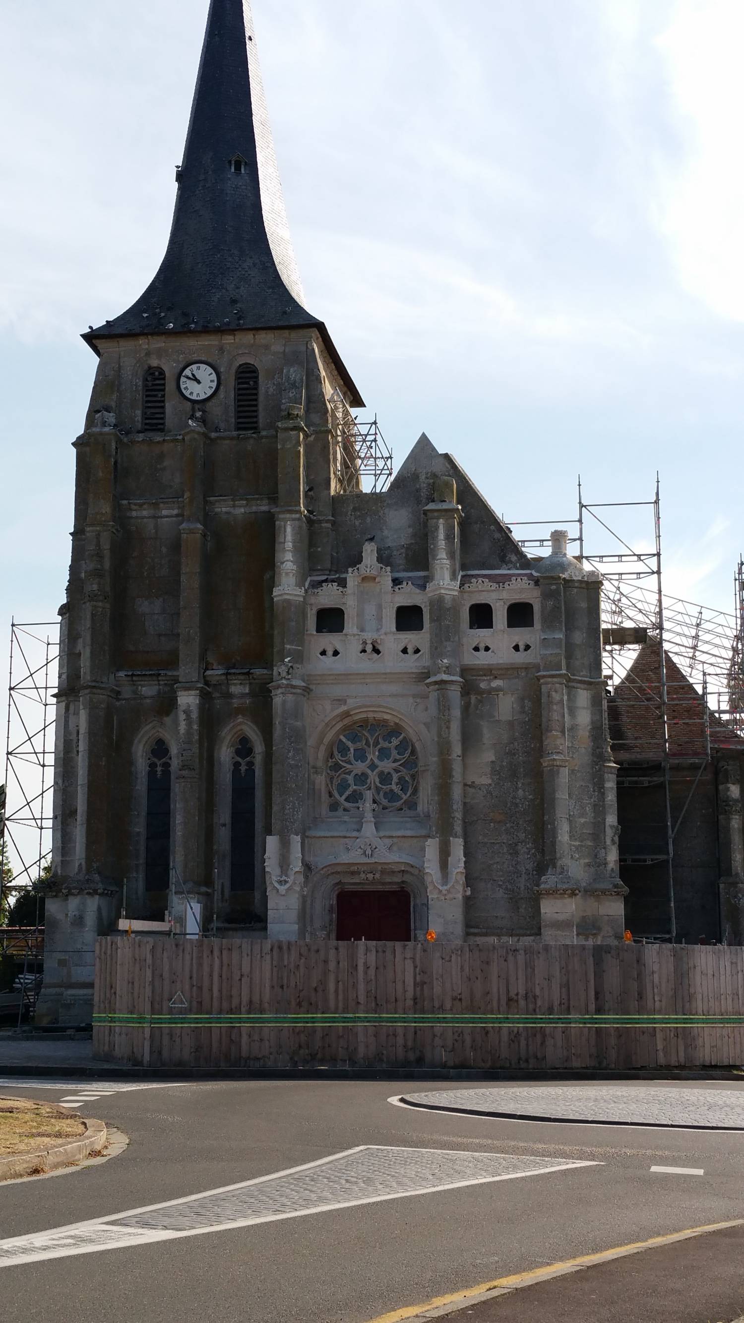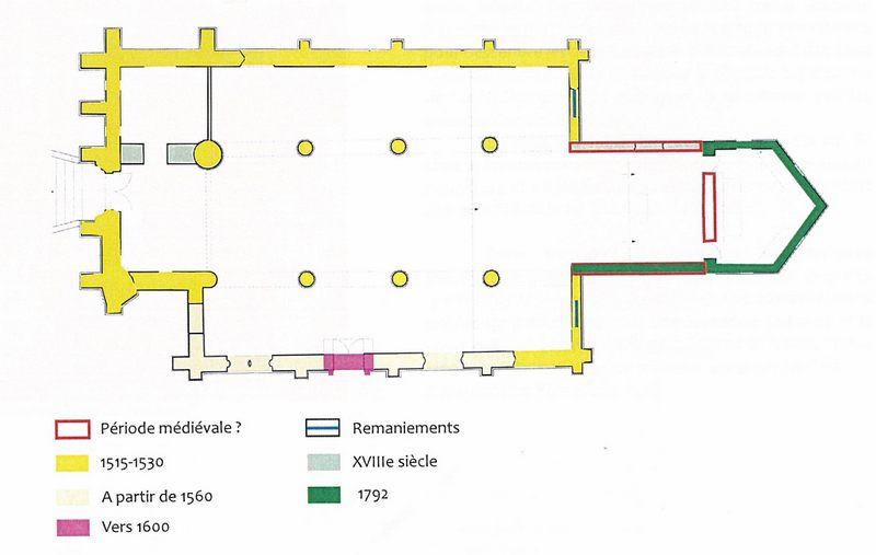 Il semblerait que le maître d’œuvre ait d’ abord prévu un plan avec large nef unique, transformé ultérieurement en un vaisseau à bas-côtés, à toitures indépendantes. Faute de moyens, ou en raison du contexte politique, le chœur ne fut pas reconstruit et il fallut attendre les années 1720 pour qu’il soit réédifié en moellons de silex à chaînages d’angles en briques selon un plan rectangulaire plus modeste, aux frais des paroissiens. Une sacristie en briques fut ajoutée dans son prolongement en 1792, plusieurs campagnes de restauration eurent lieu aux XIXe et XXe siècle et, vers 1860, on construisit au sud un local pour la confrérie de charité, aujourd’hui disparu.