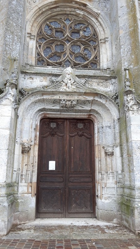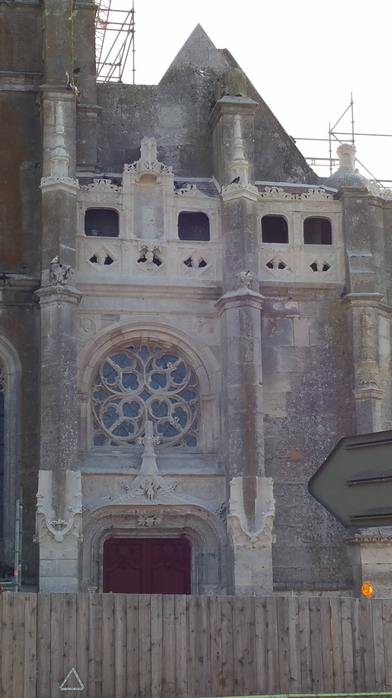 La façade monumentale à fronton, dissymétrique, comporte au nord une forte tour carrée épaulée de hauts contreforts décorés de candélabres et éclairée jusqu’à mi-hauteur d’étroites fenêtres en arc brisé. Elle est surmontée d’une flèche octogonale élancée, en charpente couverte d’ardoises. Au sud, se manifestent toute la richesse et la variété du décor Renaissance voulu par le commanditaire. Entre les contreforts, s’ouvre un portail en anse de panier, surmonté d’un gâble à fleurons ; dans le tympan a été placée une statuette de l’Enfant Jésus portant le globe sur un fond de rinceaux. Au-dessus, une baie en plein cintre, garnie de médaillons à bustes aux écoinçons, encadre une rose à quatre cercles tangents partagés en petits panneaux agrémentés d’arabesques. Dans la partie supérieure, une galerie à claire-voie, parée d’une niche surmontée d’un dais et éclairée par quatre ouvertures en anse de panier cantonnées de pilastres et couronnées de frontons, relie la tour nord à la tourelle d’escalier octogonale coiffée d’un lanternon au sud. La rambarde est ornée de cinq bustes de personnages, encadrés de losanges moulurés refaits en terre-cuite vers 1900. Le mur nord est étayé de contreforts à candélabres et percé de quatre baies en tiers-point encore gothiques alors que le mur sud a des contreforts ornés de tempietti, et des fenêtres en plein cintre, dont deux à remplage Renaissance, ainsi qu’un portail du XVIIe siècle à fronton cintré et pilastres doriques encadré de niches superposées.