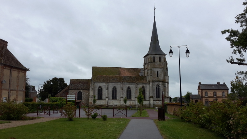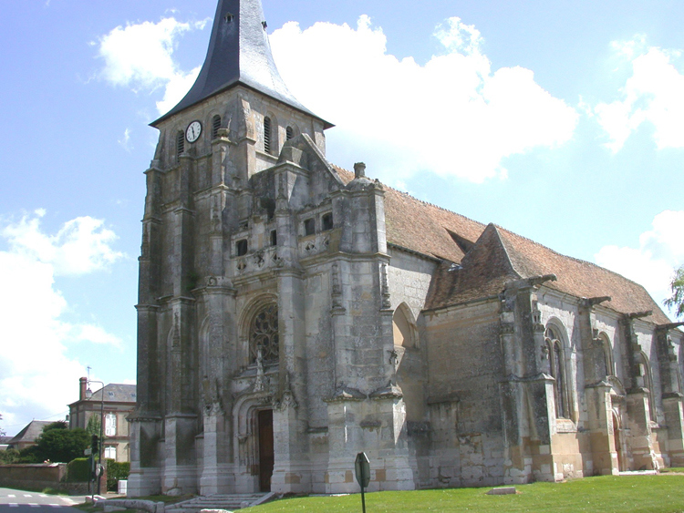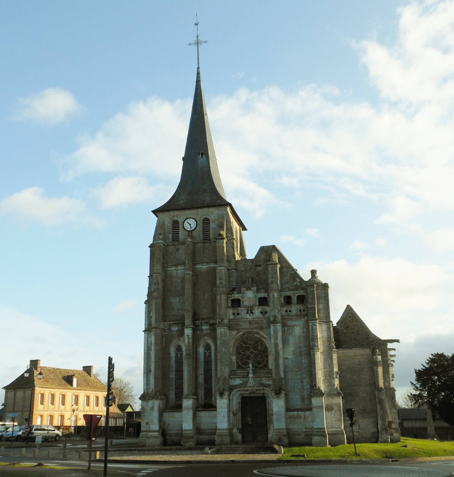 Imposante construction de quarante mètres de longueur en pierre de taille, couverte de belles toitures en tuiles plates, l’église Saint-Aubin, qui était placée sous le patronage de l’abbé du Bec, domine de sa façade majestueuse la place centrale du village.