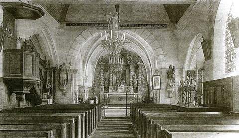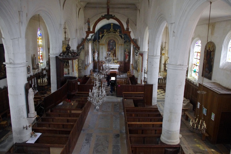 À l’intérieur, des piliers ronds sans chapiteau reçoivent des arcades moulurées en plein cintre. Nef et bas-côtés sont couverts d’une voûte en charpente. On peut encore observer les traces de départ d’ ogives d’une voûte en pierre jamais construite.