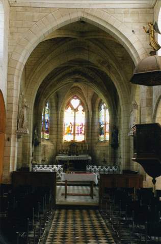Un transept de deux travées précède le chœur ; ce dernier se compose d’une travée droite très courte, percée de fenêtres simples, qui témoignent peut-être d’un état antérieur à la construction tardive de l’abside à trois pans, chacun éclairé par une large baie à réseau flamboyant qui s’accorde avec les bases prismatiques des supports et l’absence de chapiteaux. La mouluration adoucie des arcs de la voûte autoriserait à en repousser l’achèvement à la fin du XVIème s. ou au début du XVIIème s., ce qui s’accorderait à la date de 1605 relevée sur une clef de voûte du chœur par l’abbé Cannot. La partie centrale de la façade pourrait avoir été construite à la même époque.