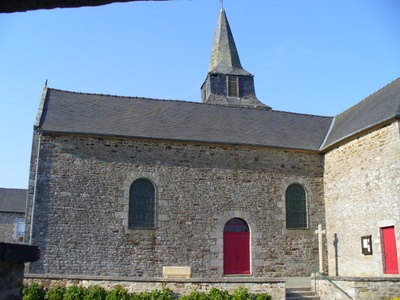 L’église Saint-Pierre, en forme de croix latine, est composée d’une nef, d’un transept et d’un chœur au chevet plat. Elle a été presque entièrement « rebâtie par les habitants » (selon une inscription surmontant le portail ouest) dans le deuxième quart du xixe s., à l’exception de la tour portant le clocher, qui a été élevée en 1666 au nord de l’édifice, et qui se trouve à l’angle de la nef et du bras nord du transept ; cette haute tour est surmontée d’une flèche en charpente couverte en ardoise. L’ensemble, d’une grande simplicité, est construit en moellons, hormis les chaînes d’angles et les encadrements des baies qui sont en granit. En 1947, l’ancien cimetière, qui entourait l’église, a été déplacé, et ne subsiste plus dans l’enclos qu’une croix monolithe scellée à l’angle de la nef et du bras sud du transept.