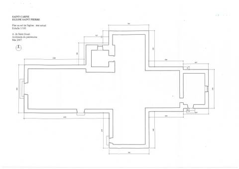 En réalité, l’édifice actuel résulte d’une série de travaux parfaitement datés. 1826 : restauration de la tour lézardée du haut en bas et reconstruction de l’aile sud du transept ; 1839 : restauration de la nef ; 1840 : réfection du portail ; 1845 : reconstruction totale du chœur (la sacristie est accolée à l’est du chœur), marquant la fin des travaux d’ensemble. Au xxe s., l’église a été l’objet de plusieurs campagnes d’entretien[1]. L’intérieur de l’église est d’une grande sobriété. Les murs sont recouverts d’un enduit blanc ; la charpente est masquée par une voûte lambrissée ; le mobilier est constitué de trois autels avec retables du xviiie s., de structure semblable : un autel en tombeau de forme galbée surmonté d’un tableau central (l’Ascension au maître-autel, le Sacré-Cœur dans le bras nord du transept, la Donation du Rosaire à saint Dominique dans le bras sud du transept) lui-même encadré de deux niches flanquées de colonnes à chapiteaux ioniques et abritant des statues (dont certaines anciennes : saint Pierre, la Vierge, saint Carné, sainte Émérence, saint Étienne), et enfin surmonté d’un entablement à fronton cintré (seul celui du retable central porte un décor sculpté : Dieu le Père dominé par deux anges soutenant la croix).