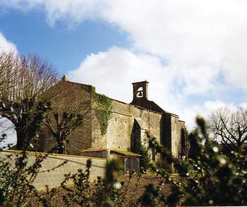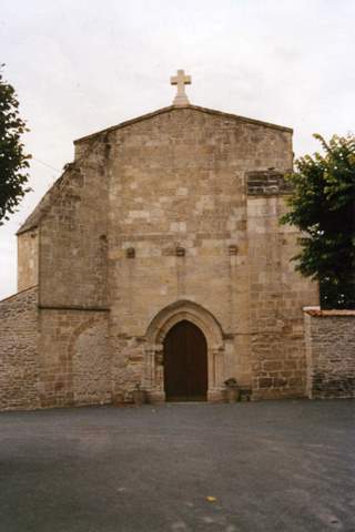 Dédiée à saint Crépin, cordonnier à Soissons, mort en 287, l’église, en 1550, relevait de l’évêché de Saintes. Dissimulé sur trois côtés par des maisons, des hangars, des appentis et des jardins, cet édifice est d’un abord peu attrayant. L’appareil extérieur des murs est très varié, accusant de multiples reprises. Seule la travée ouest, au midi, possède une corniche faite d’un simple biseau. Un clocher-arcade du XIXe s. est monté sur le doubleau qui avoisine la vis. Il porte une cloche de 1781. La façade ouest est percée d’une porte en arc brisé dont la mouluration est tardive, peut-être du XVIe s. ou seulement du suivant. Au-dessus, trois modillons de profil ondulé sont le seul souvenir d’un auvent disparu, ou ballet dans le parlé régional. Un arc-boutant obturé épaulait l’angle nord-ouest de cette façade.