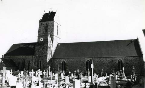 Entourée de son cimetière, l’église paroissiale de Saint-Denis-leVêtu, s’élève au centre du village.La première mention de son existence est sa donation à l’abbaye de Blanchelande en 1199 par Guillaume de Rollos et sa femme Isabelle.L’édifice actuel possède un chœur rectangulaire du xiiie s., voûté d’ogives, éclairé par trois fenêtres à remplages rayonnants. Ce chœur est séparé de la nef, reconstruite en 1750, par une travée barlongue sur laquelle s’élève le clocher dont les parties hautes datent du xvie s.Le mobilier conservé dans l’église comprend des fonts baptismaux de 1575, des statues de saint Denis céphalophore, en pierre peinte du xvie s., saint Éleuthère et saint Rustique et un grand crucifix en bois polychrome du xviie s.Le clocher nécessitait des travaux pour lesquels la Sauvegarde de l’Art français a accordé une aide de 50 000 F en 1988.