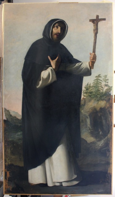 Il est vêtu de l’habit de son Ordre correspondant aux couleurs de la pureté et de l’austérité : la robe blanche et le manteau noir dont la capuche lui couvre entièrement la tête. Le corps enveloppé de ces lourdes étoffes est modelé avec beaucoup de précision et de densité. L’expression mystique et intensément réaliste de son visage, jeune, cheveux noirs et barbu, est rendue par l’effet d’ombre produit par la cagoule. Sa tête est entourée d’une auréole dorée.