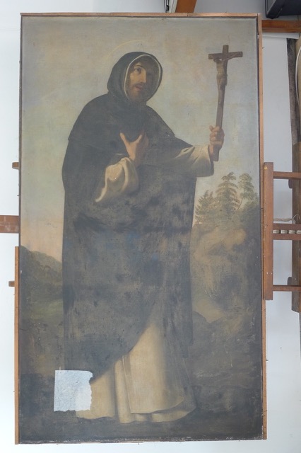Le châssis était fortement attaqué par des insecte du bois et trop endommagé pour continuer à accueillir la toile. La toile était très endommagée, remplie de cadavres d’insectes. Elle avait subi l’humidité et présentait des traces de moisissures. La couche picturale, elle était dans un relativement bon état. La restauration a permis de traiter la toile, de l’aplanir, de remplacer le châssis et de redonner à la couche picturale son éclat.