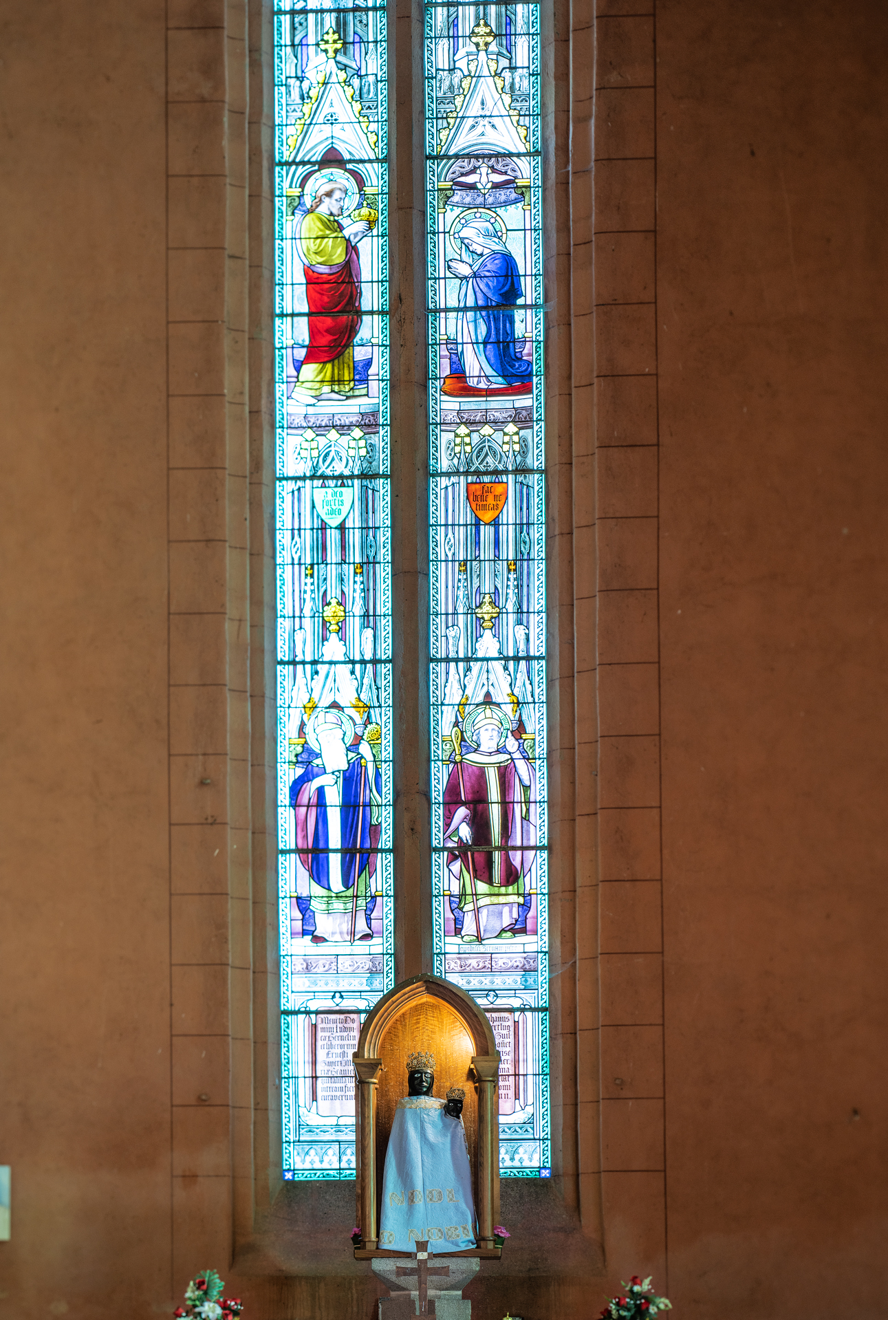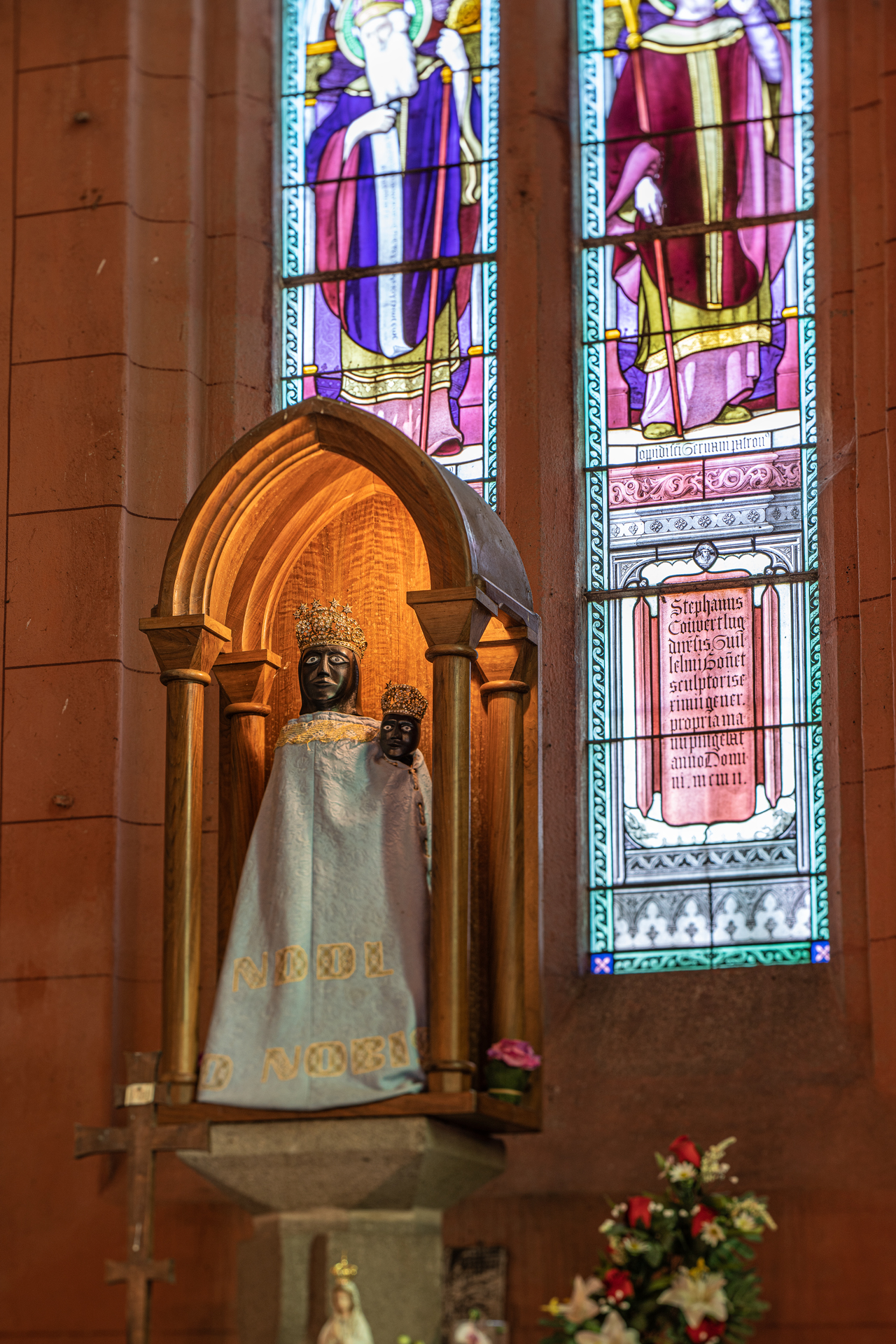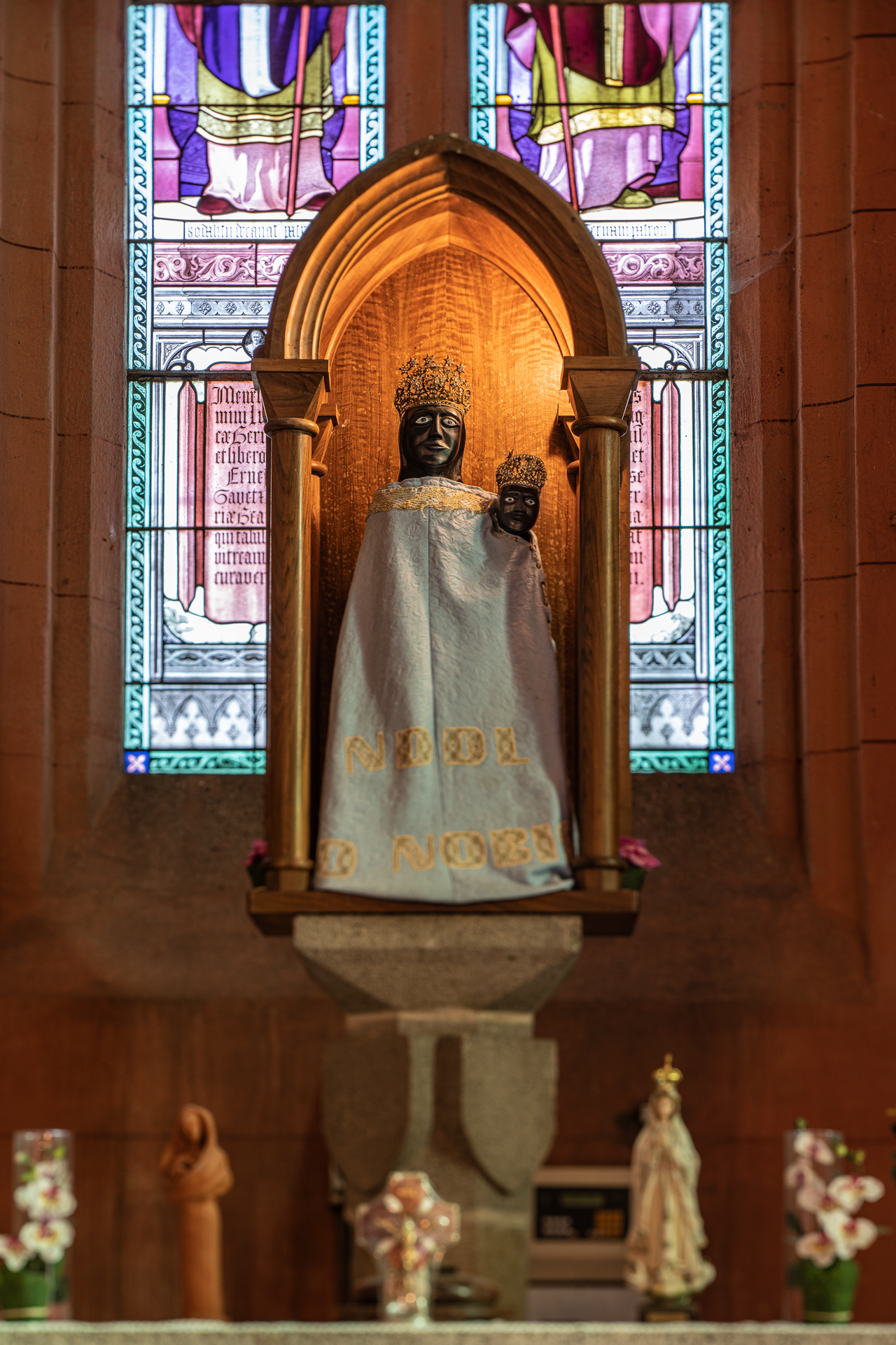 Quant à la Vierge, sa statue a été volée mais elle a été refaite à l’identique en conservant son type : Vierge debout, d’une taille d’environ 70 cm, portant l’Enfant sur le bras gauche, drapée, les parties visibles étant foncées. Sur des clichés de la fin du XIXes., on distingue les sculptures du corps et une date, 1541, peinte sur le socle, encore visible vers 1890, qui est restée sans interprétation mais permettrait peut-être de dater le corps de la statue, le visage de la Vierge pouvant être antérieur.