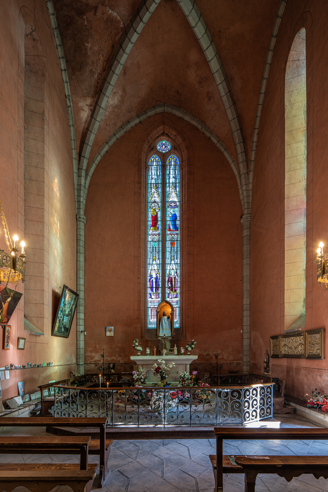 Ce dernier commença par le chœur, le sanctuaire de la Vierge. Il est carré, haut de 13 mètres, couvert par une voûte sur croisée d’ogives. Sa toiture est en pavillon et deux contreforts d’angle l’épaulent. Il est éclairé par une baie haute de 8,50 m et large de 1,40 m, animée par un mince meneau, surmontée d’une rosace. Les lancettes des murs latéraux sont à peine moins hautes. Massif et aérien, l’effet est saisissant. Sur le mur sud une porte élégante encadrée de deux colonnettes de calcaire et surmontée d’un arc ogival, constituait l’accès du clergé.