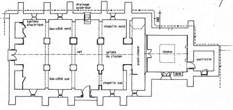 Le plan se compose d’une nef flanquée de bas-côtés et d’un chœur plus étroit à chevet droit. L’ensemble, couvert en tuf, est homogène ; il est conforté par des contreforts à ressauts.