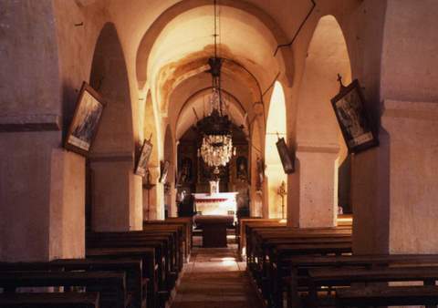 La nef communique avec les bas-côtés par des arcades en arc brisé reposant sur de puissants piliers chanfreinés. Le couvrement est formé de voûtes en berceau plein cintre ; la première travée sous le clocher souffre d’un important dévers ; les bas-côtés sont couverts de voûtes d’arêtes. Les arcs doubleaux reposent sur des culots pyramidaux du côté de la nef et sur des piliers engagés sur les bas-côtés. On observe une disposition assez originale sur le revers du mur pignon ouest, formée par trois arcades, permettant une contrebutée intérieure.