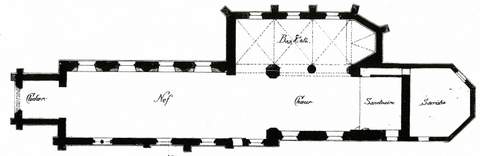 Précédée d’un clocher-porche édifié au début du XXe s., la nef de quatre travées se poursuit par un chœur légèrement en retrait sur lequel ouvre, au nord, par trois grandes arcades, une chapelle latérale. Le sanctuaire est dominé par un maître-autel imposant, adossé à une cloison, qui ne s’appuie pas contre le chevet de l’église : en effet, par un passage aménagé dans le flanc nord de l’édifice, on accède à l’espace dévolu à la sacristie qui termine l’édifice à l’est par un chevet à pans coupés.