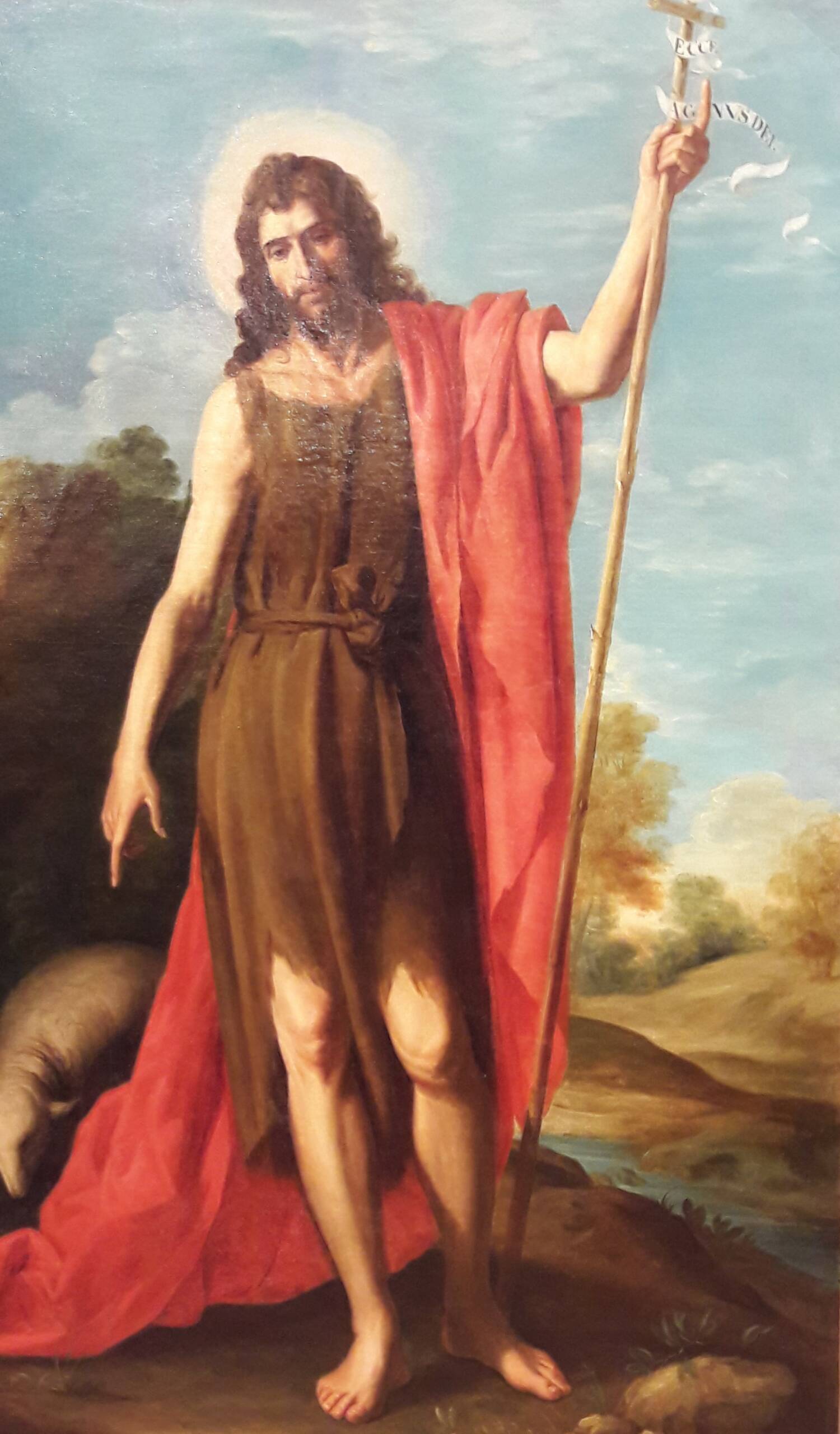 Cette peinture est une copie partielle du tableau de José Leonardo. Elle représente Saint Jean-Baptiste de face, debout. Ses cheveux sont longs, sa barbe est fournie ; il porte une tunique brune et une longue cape rouge. Dans sa main gauche, il tient un bâton de pèlerin, l’index pointé vers le haut derrière lequel on aperçoit une oriflamme où figure l’inscription « Agnus Dei ». Son bras droit, derrière lequel on aperçoit un mouton, est tendu vers la terre qu’il montre de l’index. Sa tête est auréolée d’un halo de lumière et il marche sur un sol vallonné. A droite, au premier plan, une branche apparait au niveau de ses jambes. Juste derrière, une rivière s’enfonce vers l’horizon où l’on aperçoit des arbres auréolés de lumière. A gauche, un grand arbre, plus proche, masque le ciel jusqu’au niveau de son avant-bras. Un ciel bleu et nuageux orne la partie supérieure de la toile.