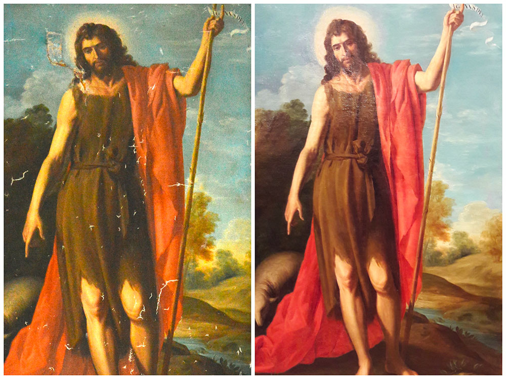 L’œuvre avait subi une première restauration qui avait rétréci ses dimensions par un encadrement modifié, cachant ainsi un pied de Jean-Baptiste et la tête du mouton. Des pièces de toile avaient été collées pour combler certaines lacunes avec une colle inadaptée, et la couche picturale présentait de larges craquelures. Le bois du châssis du support était vermoulu et parasité.