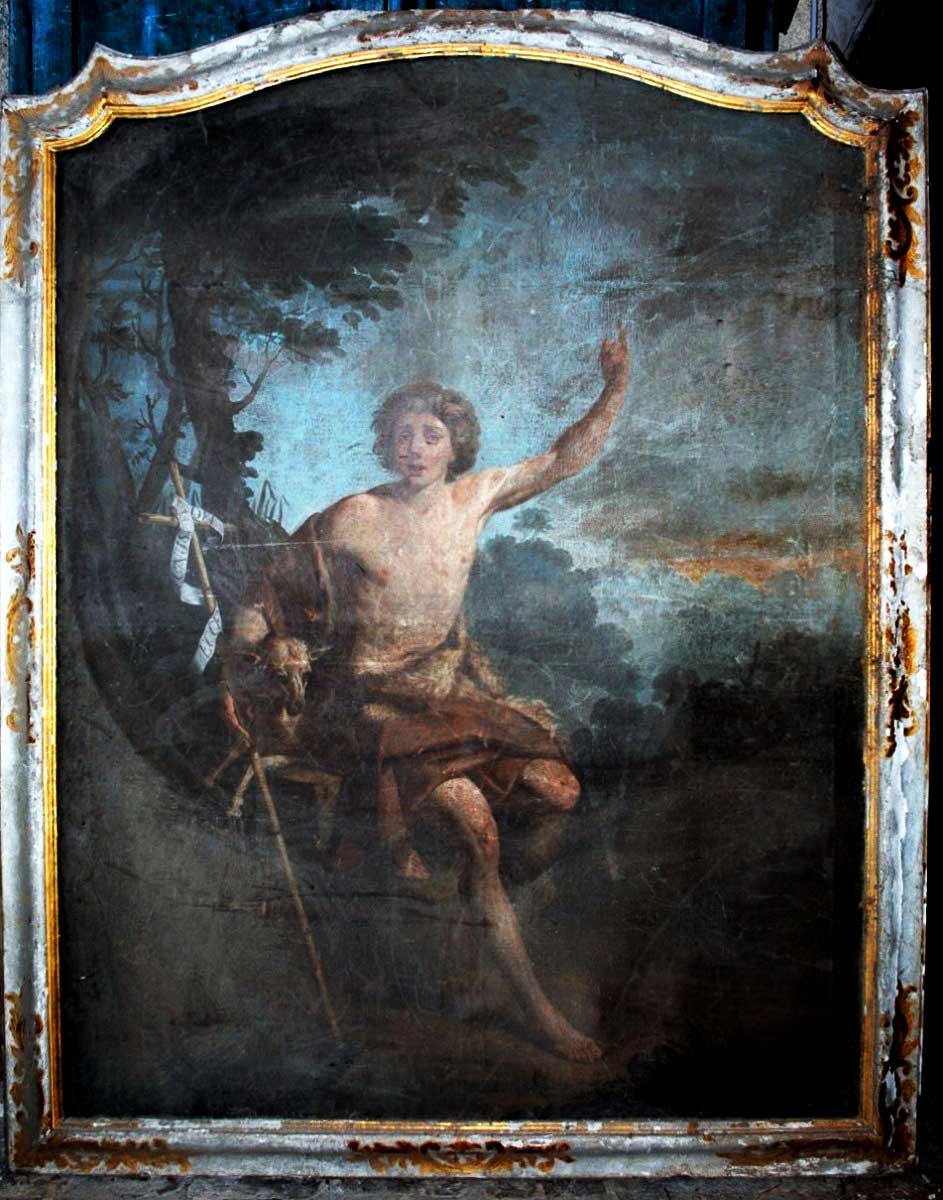 La toile représente saint Jean-Baptiste selon une iconographie codifiée bien avant le XVIIIème siècle, ici placé dans un cadre végétal aux couleurs bleutées. Au premier plan, le saint est assis sur un tronc d’arbre, près d’une source, la jambe gauche repliée et la jambe droite détendue, le torse de face. Il regarde le spectateur tandis que son index gauche désigne le ciel.