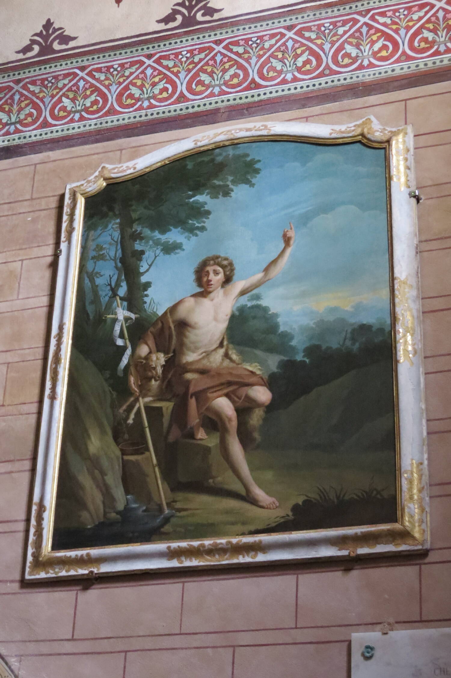 Dans le creux de son bras droit se trouve un agneau, alors que sa main tient une croix, symbole de la Passion du Christ, autour de laquelle s’enroule le phylactère désignant l’« Agneau de Dieu ». Il est vêtu d’une peau de bête tombant sur ses hanches. La position du saint, son vêtement, l’agneau et le phylactère sur la croix identifient assurément saint Jean-Baptiste, cousin de Jésus Christ. Il mène une vie d’ascète dans le désert (que son vêtement rappelle) avant de se déplacer sur les bords du Jourdain où il baptise Jésus. Ce saint annonce la venue du Messie (agneau et geste).