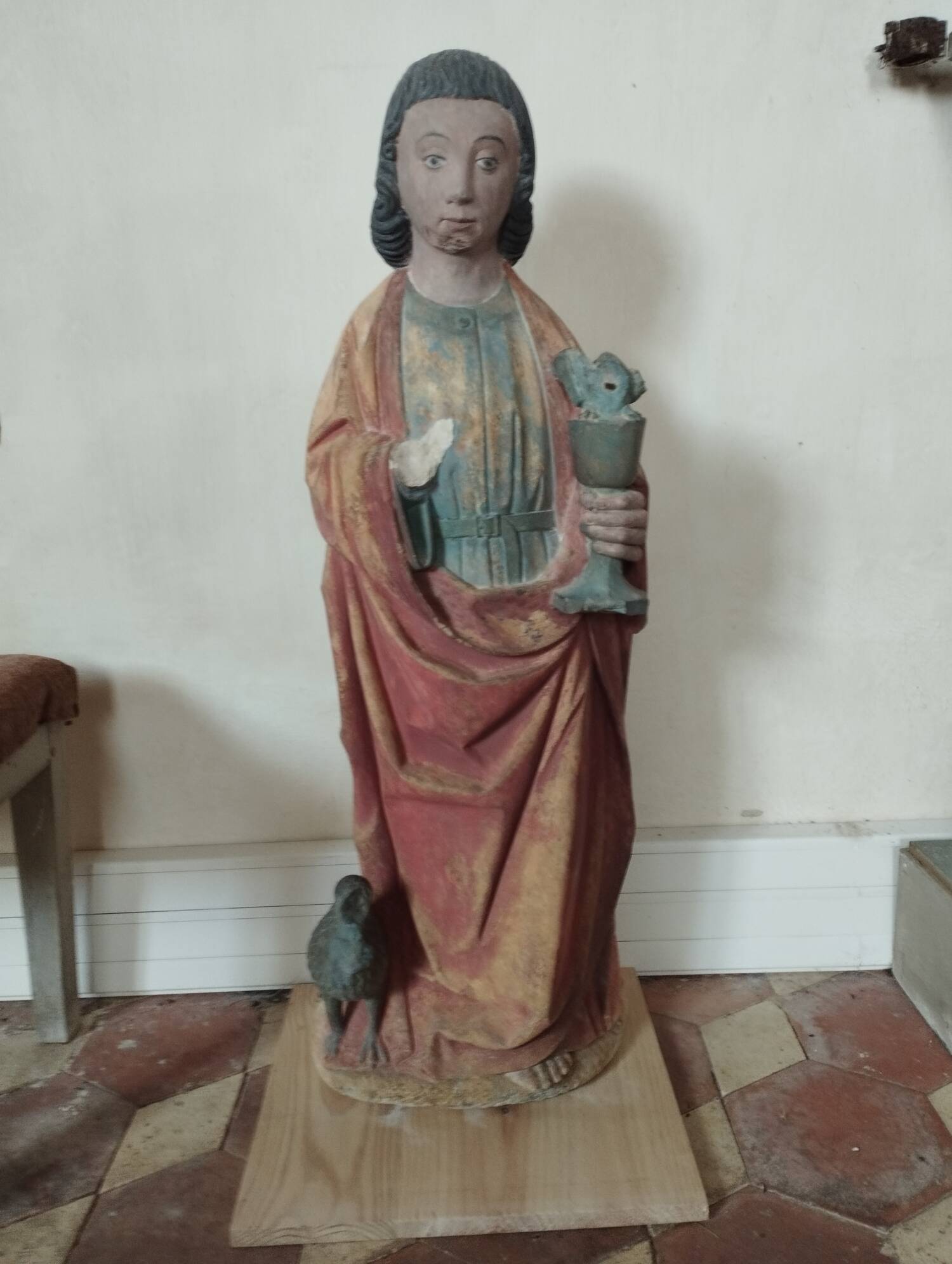 Cette statue est arrivée première dans le suffrage des lycéens. Elle date du XVIème siècle et marque d’abord l’esprit par son état de conservation. Il serait facile d’arguer que cette tête et cette main droite désespérément manquantes n’abondent pas dans le sens de notre première observation, mais, la tendresse de ses couleurs si bien conservées fait taire les réserves. Le noir profond de ses cheveux augustes, les boucles et les profondeurs données à cette toison par le sculpteur, la teinte tannée et unie de la peau imberbe de saint Jean, le rouge pâle et puissant de sa robe ou encore le vert blanchi de sa tunique, imaginer que ces pigmentations-là ont traversé les siècles jusqu’à nos yeux : cela est mystique. Apôtre aux nombreux miracles, s’il n’en fallait retenir qu’un seul, ce serait celui du poison. Pour prouver aux Ephésiens la supériorité du christianisme, il boit l’intégralité d’un calice de poison sans en ressentir le moindre effet. Les deux autres goûteurs sont frappés par la puissance corrosive du liquide et meurent. Saint Jean les ressuscitera par la suite. De ce fameux miracle, on peut apercevoir dans la main gauche de la statue un calice dont émerge un serpent, symbole du poison vaincu par la foi du saint. Cette main est, malheureusement, la seule restante. L’autre est perdue à jamais. La tête quant à elle, a beau avoir quitté le tronc, elle est encore en la possession des paroissiens.