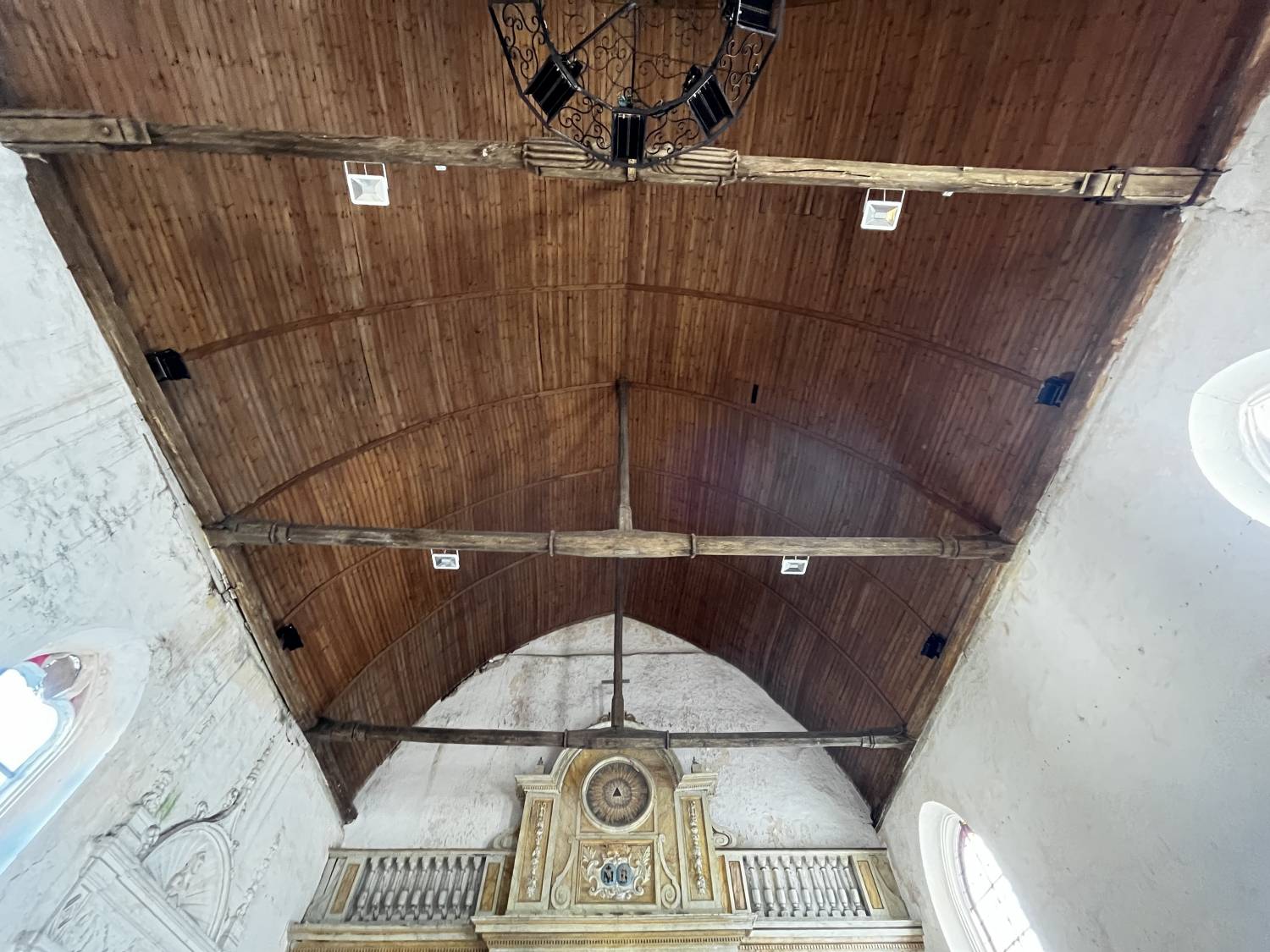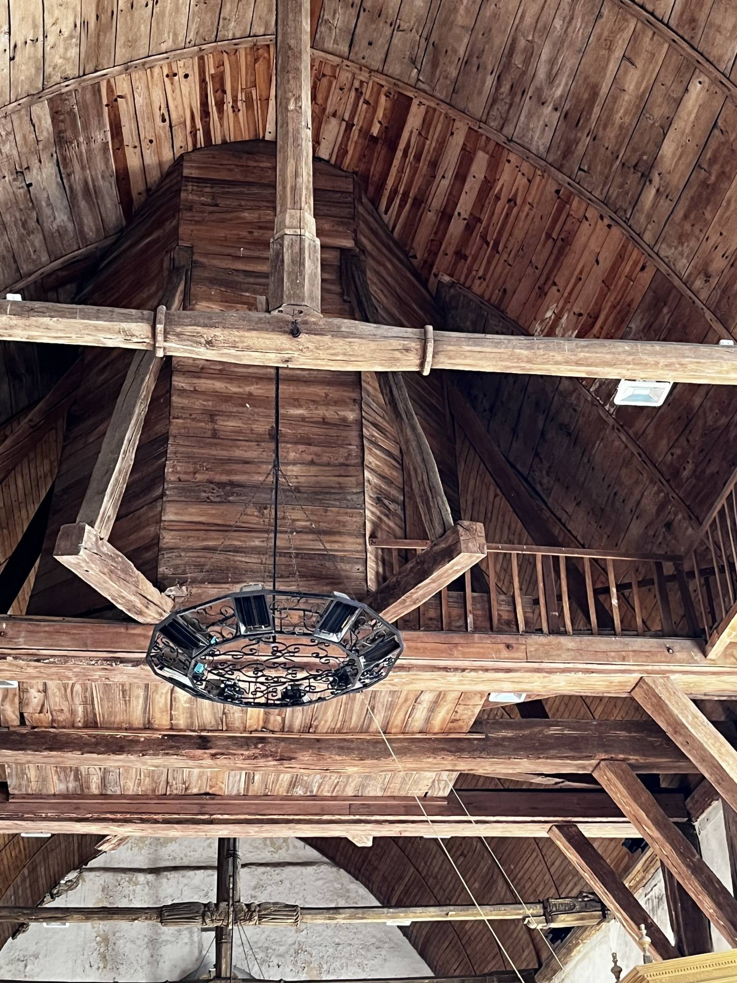 L’intérieur est couvert d’un lambris aux entraits décorés de têtes de monstres à leurs