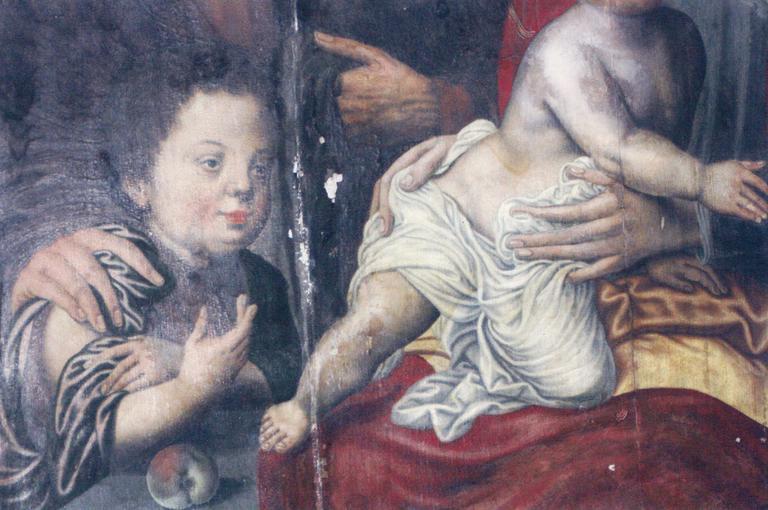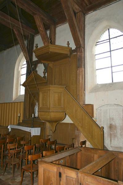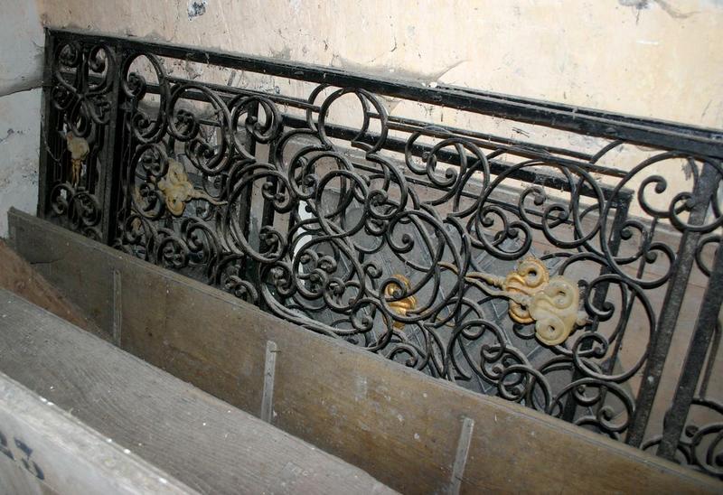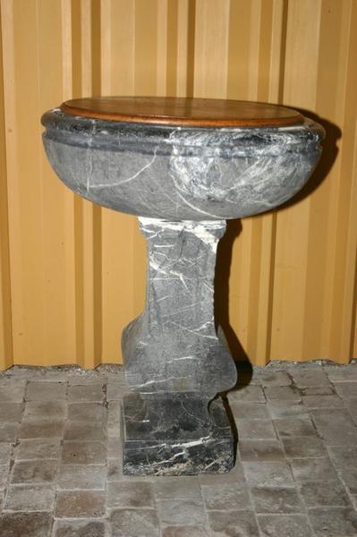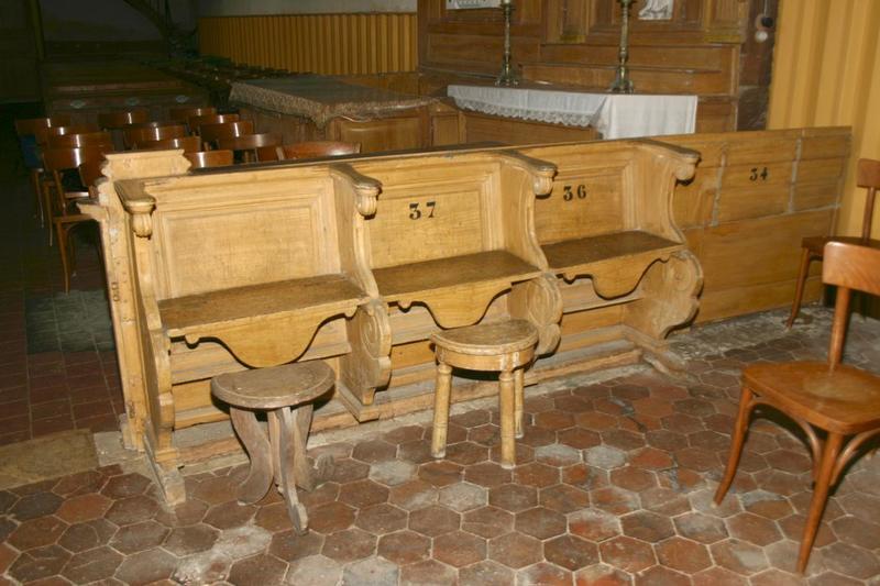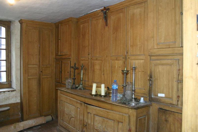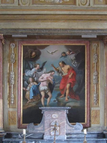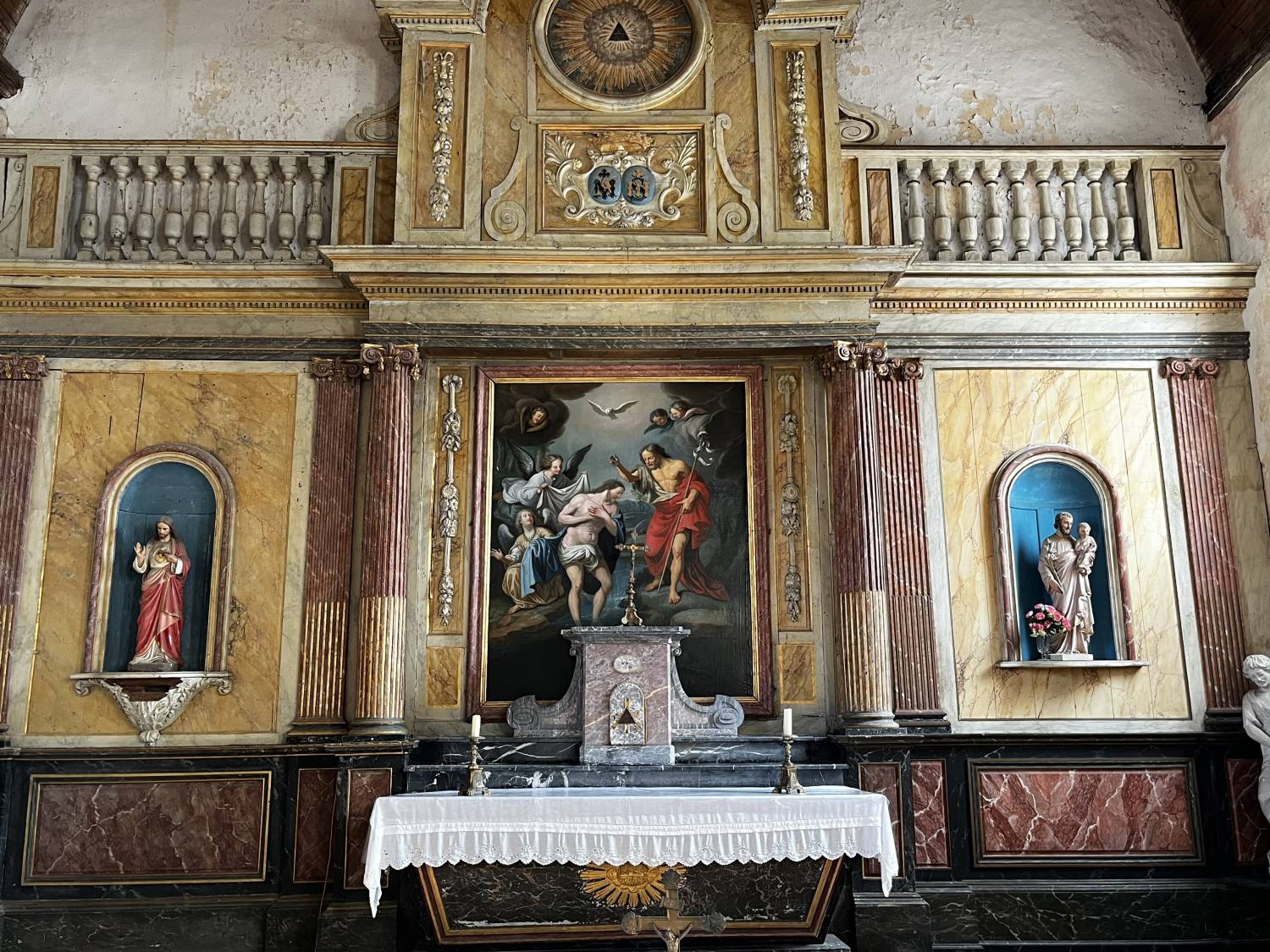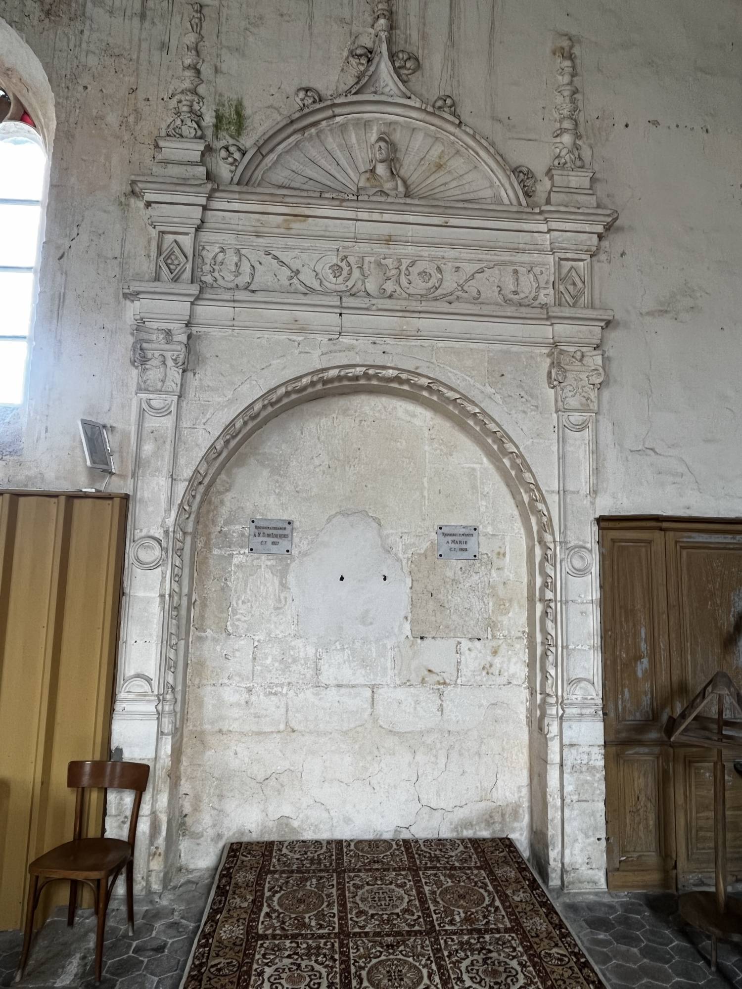 L’enfeu, dans le choeur, du côté gauche, est formé d’une arcade entre deux pilastres qui portent un entablement surmonté d’un galbe cintré et de deux candélabres. Un écusson accosté de putti et de rinceaux décore la frise, et le galbe est occupé par un buste de femme casquée devant une coquille.