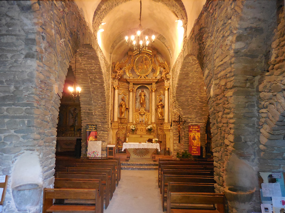 L’église composée d’une nef encadrée de deux bas-côtés ouverts par des arcades cintrées sur la nef qui est voutée en berceau. Le choeur est à chevet plat, et le clocher est un mur transformé en tour à l’ouest par adjonction d’une travée de maçonnerie vers l’est, couverte à quatre pans et d’un escalier sur rampant de couverture.