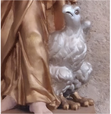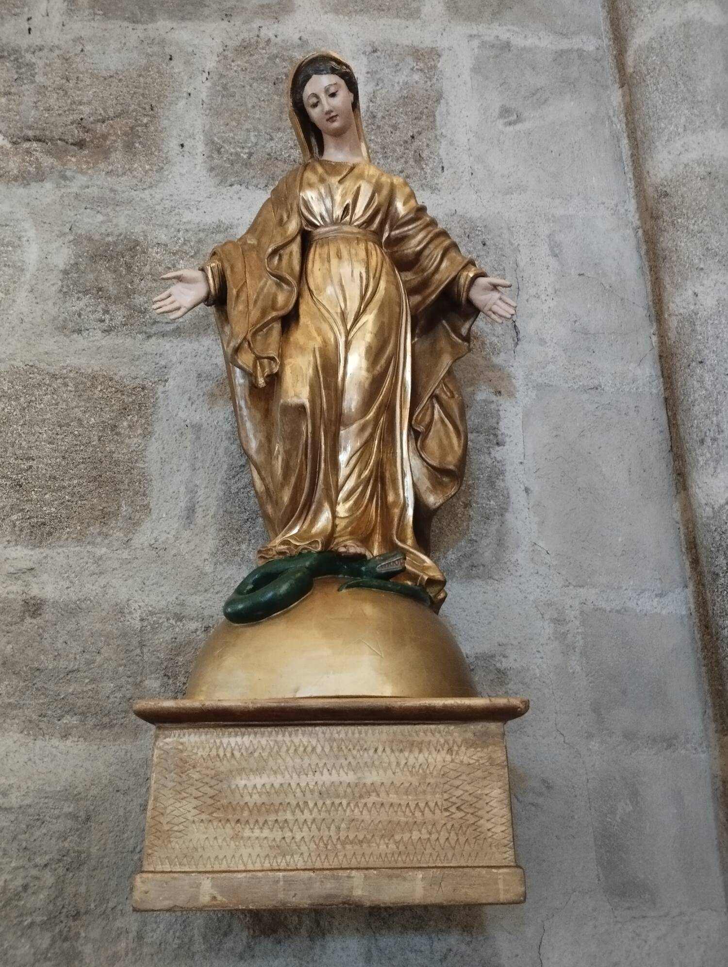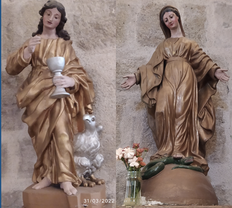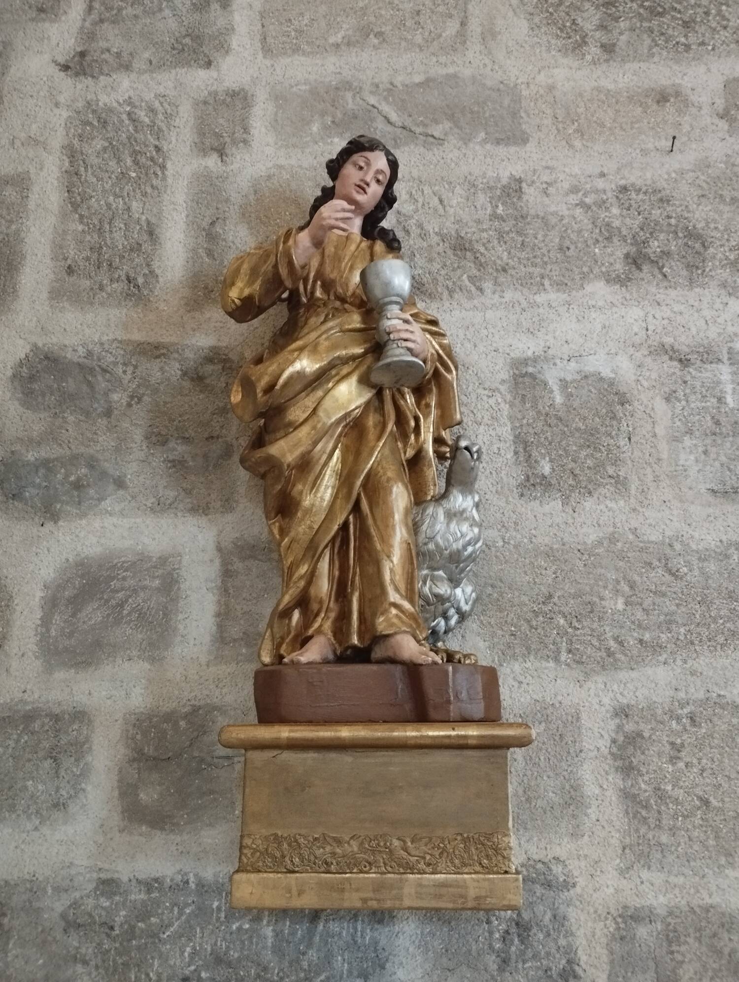 L’église de Beauzac possède deux objets qui méritent une attention toute particulière. Il s’agit d’une une statue de saint Jean et une statue de la Vierge au serpent. Cependant y’a quelques années ces objets avaient subi une restauration malheureuse. L’altération principale de ces objets était liée à un repeint non original, réalisé avec une peinture acrylique dorée sur les drapées, argentée pour l’aigle de saint Jean, et de couleur chair pour les mains de saint Jean et la Vierge. De nombreux coups de pinceau étaient visibles, la qualité et l’application de cette peinture nuisaient à l’aspect des œuvres, recouvrant la feuille d’or originale visible par endroit. De plus, cette peinture en recouvrant la surface de I’ œuvre, masquait de potentiels altérations sous-jacentes.