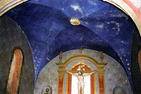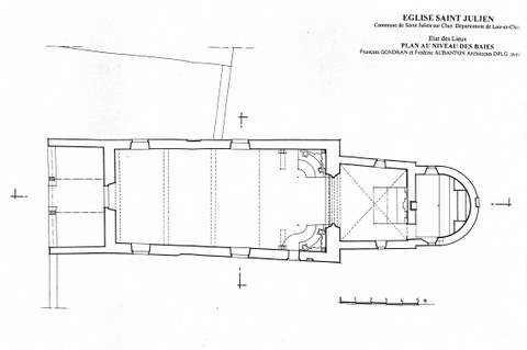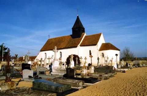 De l’église primitive du XIIe s, il ne subsiste que l’abside, aménagée en sacristie et dont les dispositions d’origine ont été altérées, et la partie est de la nef aménagée en chœur. La nef actuelle, plus large que la partie romane subsistante, a été élevée au XVe et au XVIIe siècles. Elle est précédée à l’ouest d’un petit porche. L’abside était sans doute voûtée en cul-de-four, ainsi que le signalent le Dr Lesueur et E. Pilte, mais le plafond en plâtre moderne empêche toute vérification. Ces auteurs signalent également de petites fenêtres en plein cintre murées, dont certaines sont encore visibles dans les placards de la sacristie, et les vestiges d’un cordon à billettes entourant une ouverture en plein cintre située dans l’axe du chevet. Il s’agit peut-être de l’archivolte d’une fenêtre murée ou plutôt d’un réemploi. Le chœur, couvert d’une voûte d’arêtes en briques modernes, s’ouvre largement sur la nef par un arc triomphal en plein cintre dont la modénature et les bases prismatiques s’apparentent au XVe siècle. Il est éclairé par deux fenêtres latérales en plein cintre et a conservé un décor stylisé au pochoir du XIXe siècle. A l’ origine, le chœur et la nef étaient couverts d’un lambris peint aux trois quarts, conservé dans les combles. Cet ensemble présente un décor de faux joints ocre rouge sur fond blanc imitant un appareil de briques. La nef a été élevée en deux temps, la partie orientale, au XVe s., ainsi qu’en témoigne l’arc triomphal, et la partie occidentale avec la façade, au XVIIe siècle ; elle ne possède aucun décor et est éclairée par des baies en plein cintre appareillées. De cette époque dateraient également les voûtes actuelles du chœur et le plafond plusieurs fois restauré de la nef. Deux dates figurant sur la façade sud, « 1633 » et « 1653 », correspondent peut-être à cette campagne de travaux. Le clocher en charpente date des années 1840-1850 et repose sur des poutres de bois appuyées sur les murs de la nef en avant du chœur à la hauteur des autels latéraux. Il est recouvert d’ardoise, alors que l’ensemble de l’édifice est couvert de tuiles plates. Le pignon de la façade ouest est à demi masqué par le porche dont la couverture est soutenue par deux poteaux. Le portail en plein cintre est surmonté d’un oculus.