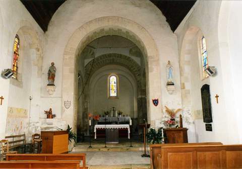 La nef est séparée du transept par un arc en plein cintre. La croisée du transept qui supporte le clocher est voûtée d’une coupole sur trompes. Cette partie est vraisemblablement la plus ancienne de l’édifice. Des passages berrichons entre nef et croisillons ont peut-être anciennement existé. Les bras du transept ont été transformés au XIXème s. en sacristie. A l’est, un arc en plein cintre donne accès au chœur formé d’une travée couverte en berceau terminée par un chevet plat. Cette partie de l’édifice a été réédifiée en même temps que la nef. Le clocher, carré, d’époque romane comporte deux étages éclairés par des baies en plein cintre. Les deux baies fermées du premier étage sont entourées d’arcs à double rouleau, celles du second étage sont géminées. Ces deux étages sont séparés par trois cordons qui reposent sur des modillons grossièrement sculptés.