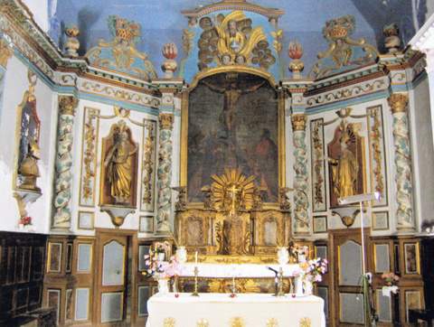 Le retable majeur, du XVIIe s., en bois polychrome, occupe tout le fond du chœur. Il est composé en triptyque, rythmé par des colonnes torses surmontées de pots à feu. Les panneaux latéraux portent les statues de saint Pierre et de saint Lary, ou Hilaire. Le panneau central est occupé par une toile représentant la Crucifixion. La composition est surmontée du buste en relief de Dieu le Père, bénissant. Sur le mur droit du chœur, une autre représentation de saint Lary présente un mouvement plus accentué.