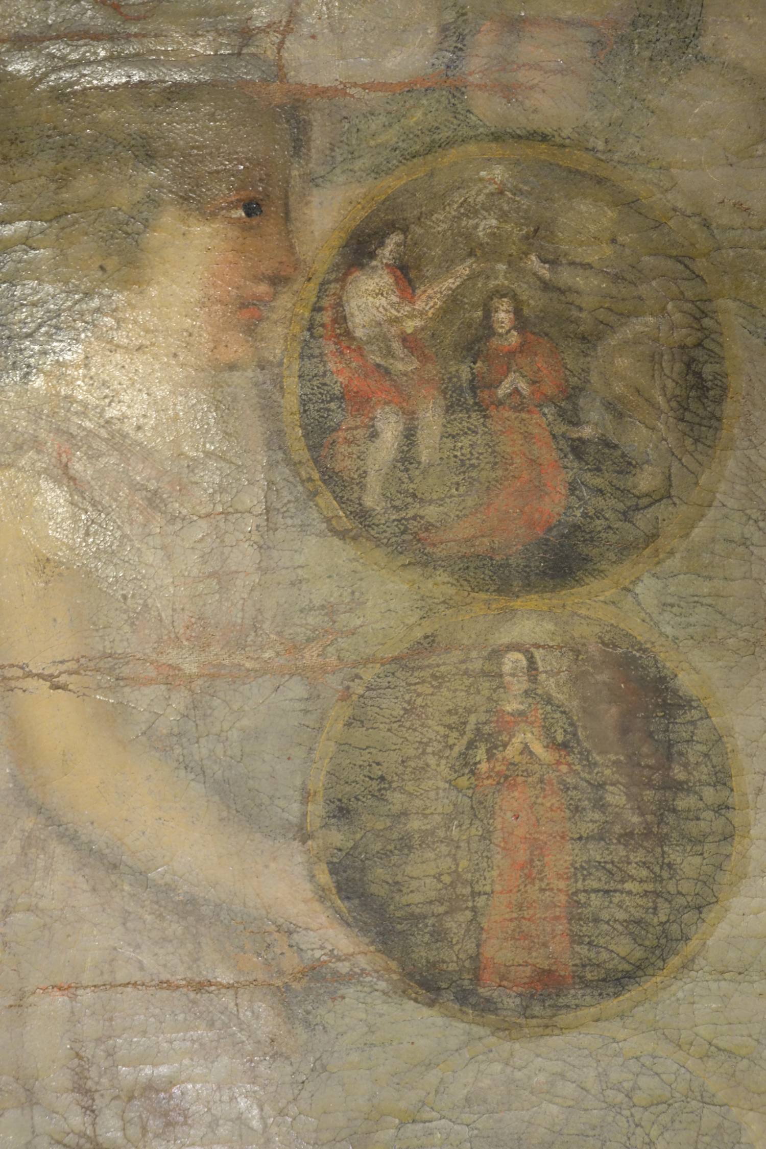 A leurs pieds se trouvent, de part et d’autre, saint Dominique et sainte Catherine de Sienne, reconnaissables à leur tenue de dominicains. Chacun tend un bras vers le haut, ce geste suggérant l’acte de la donation. En effet, malgré la lacune, il apparaît que la Vierge tend le rosaire à sainte Catherine, tandis que saint Dominique le reçoit de l’enfant Jésus. Ce dernier est suivi, au regard de leur costume, de membres du clergé.