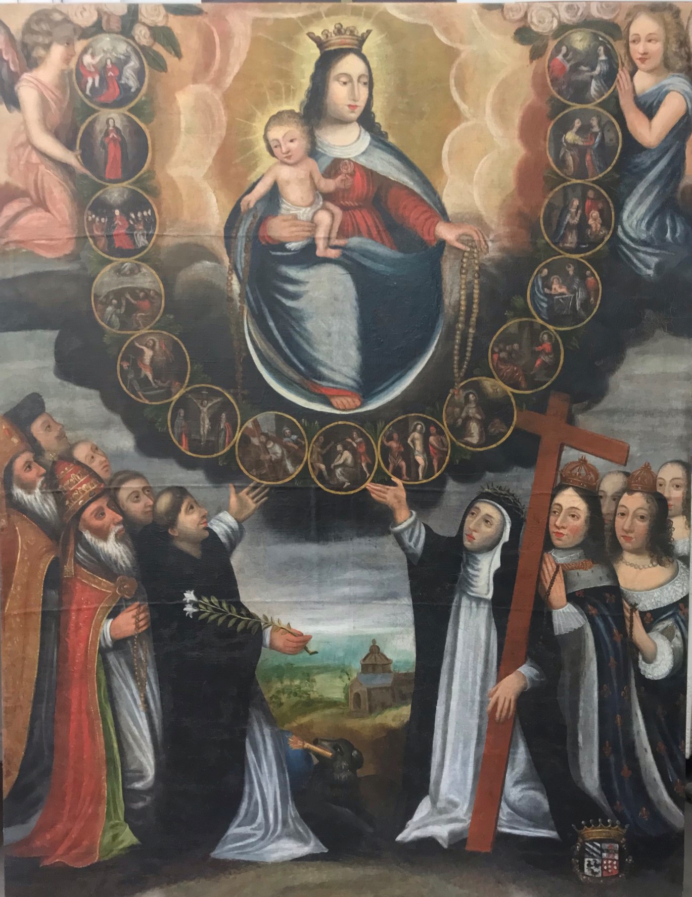 Cette grande toile, très abîmée, représente une scène de donation du Rosaire à sainte Catherine de Sienne et saint Dominique, ainsi qu’un renouvellement du Vœu de Louis XIII par Louis XIV. Probablement datée entre 1650 et 1652, cette huile sur toile de 2,10m de haut sur 1,63m de large a été retrouvée dans le presbytère de l’église Saint-Laurent à Saint-Laurent-sur-Oust, dans le Morbihan. Une œuvre à l’iconographie complexe, liée à l’histoire locale, témoignage d’une commande du seigneur de Beaumont au XVIIe siècle.