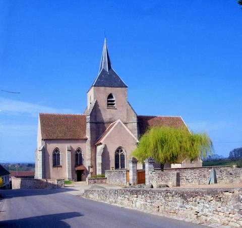 Le clocher soutenu par de puissants contreforts obliques est surmonté d’une fine flèche en ardoises. Un bas-relief ancien (fragment d’une Vierge en majesté ? XIIIe siècle ?) est remployé tout en haut du contrefort sud-ouest. La porte sud de la nef, ainsi que la porte d’un oratoire situé au nord du chœur, sont des œuvres en bois sculpté de Marc Hénard (1979).