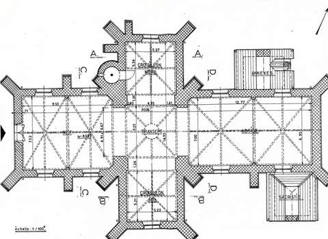 La nef, vaisseau unique de deux travées, ainsi que la façade occidentale, ont été reconstruites en 1856, dans un style sobre néoflamboyant. Les autres parties de l’édifice sont anciennes, réalisées entre la fin du XVe et le XVIe siècle. La croisée du transept qui porte la tour du clocher est encadrée de quatre grandes arcades brisées, sans moulure, reposant sur de simples tailloirs chanfreinés, et surmontée d’une voûte d’ogives, l’ensemble étant taillé dans un granit gris. Les bras nord et sud, éclairés par une fenêtre à remplage Renaissance, sont voûtés d’ogives prismatiques en calcaire blanc. Au nord, les nervures retombent sur des masques très stylisés (l’un aux oreilles démesurées). Le chœur à chevet plat est composé de deux travées percées de baies à remplage flamboyant. Les voûtes ont un tracé complexe de liernes et tiercerons, en forme d’étoile pour la première travée, et de fleur pour la seconde. Les nervures au profil prismatique pénètrent dans les colonnes engagées, de structure simple, sauf à l’angle nord-ouest de la première travée, où une console est ornée d’un beau buste d’homme bien caractéristique de la Renaissance.