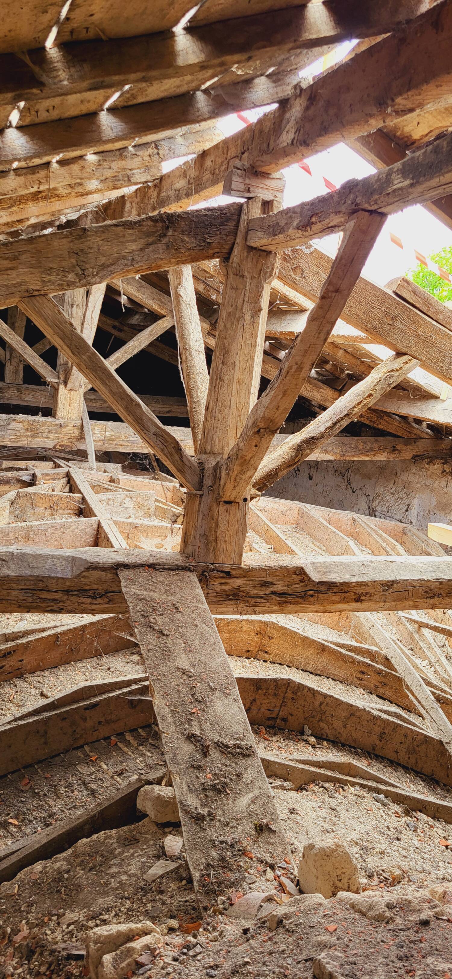 L’édifice a connu plusieurs phases de remaniements, visibles dans la charpente, qui possédait à l’origine trois niveaux distincts, et dans les murs extérieurs marqués par des reprises de maçonnerie, probablement liées à des épisodes de destruction (incendies, conflits, effondrements ?). Une grande campagne de restauration a été menée au XIXe siècle, avec la réfection en plâtre des voûtes, suivie au XXe siècle de travaux d’assainissement, de rejoinoiement et de remaniement de la couverture, assurant la pérennité de cet édifice singulier au fort caractère patrimonial.
