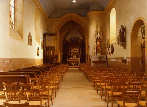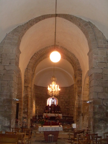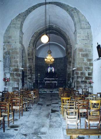 La nef, plus large que le transept, est couverte d’un lambris plâtré. On y remarque quelques remplois romans. La croisée du faux transept ouvre par deux arcs en plein cintre sur des croisillons bas relativement récents, couverts eux aussi en berceau. L’arc triomphal au cintre brisé, surélevé après la fin du Moyen Âge, conserve deux chapiteaux, l’un sans décor, l’autre à crochets à peine ébauchés. Les bases sont à griffes. Le cul-de-four et le berceau qui le précède ont été refaits, comme le berceau brisé qui couvre la croisée du faux transept raidie par d’épais dosserets ; on note la présence d’éléments de sculpture en réemploi et d’une double corniche.