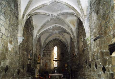 Elle se compose d’un vaisseau unique (longueur 17,02 m ; largeur 4,66 m) de trois travées, la dernière terminée par un mur droit formant chœur. Les dimensions sont modestes, le plan banal en Limousin. L’édifice n’en présente pas moins un réel intérêt. Le volume intérieur a d’heureuses proportions. Des voûtes d’ogives couvrent le vaisseau sur toute sa longueur. Les nervures, de profil torique aminci, retombent sur les chapiteaux de colonnettes installées à 2,50 m du sol sur des culots à masques humains ou simplement agrémentés de moulures. Il est évident que ces croisées d’ogives ont été lancées dans une seconde campagne, plus tardive, après que la couverture de l’édifice eut été assurée. Une simple charpente suffisait. Il n’y a aucune trace d’arrachement d’une primitive voûte en berceau, éventuellement effondrée.